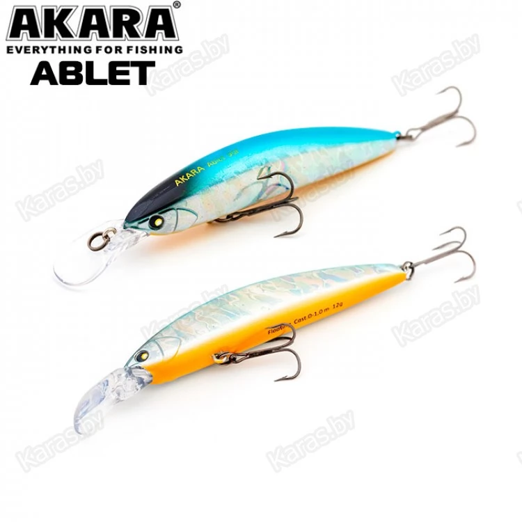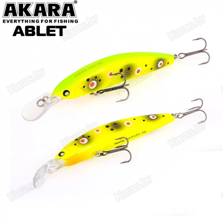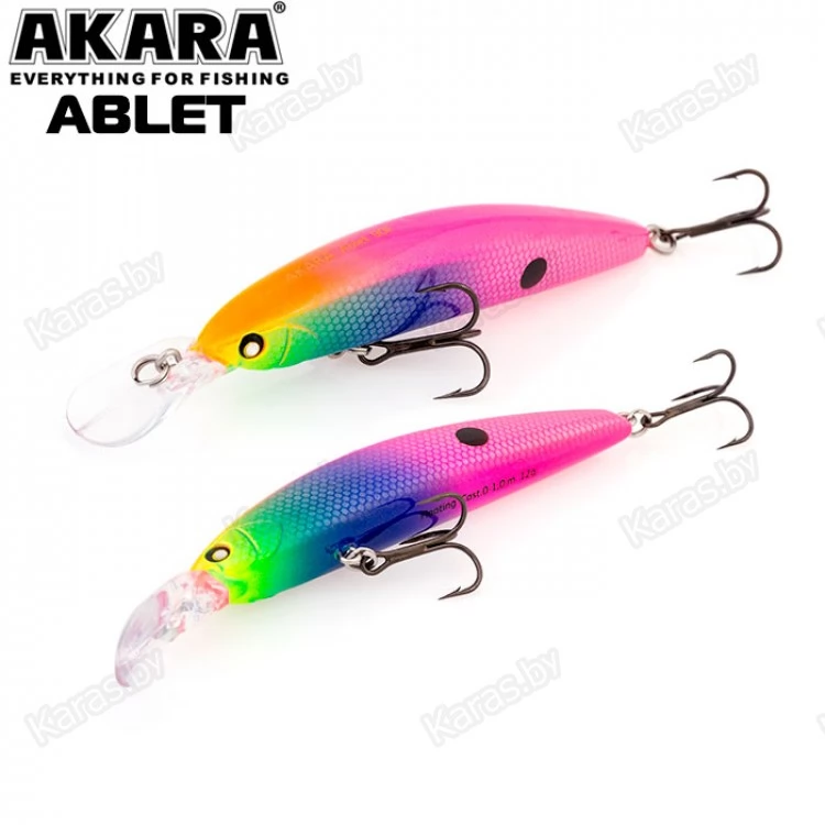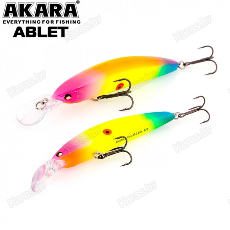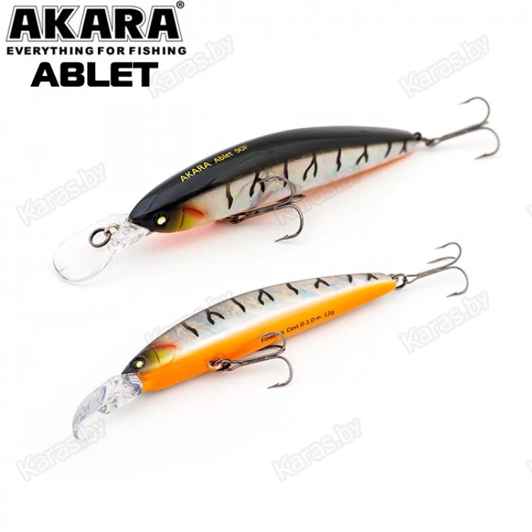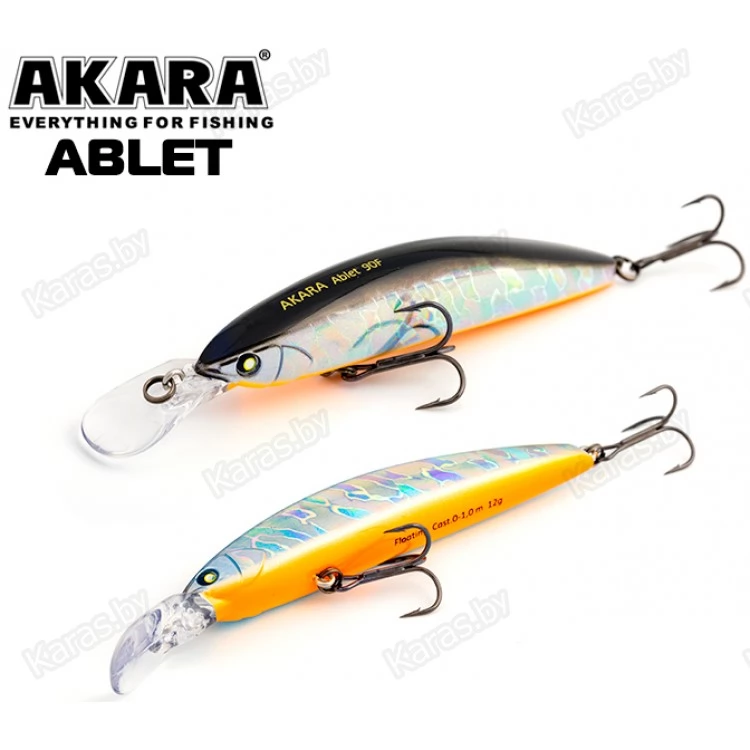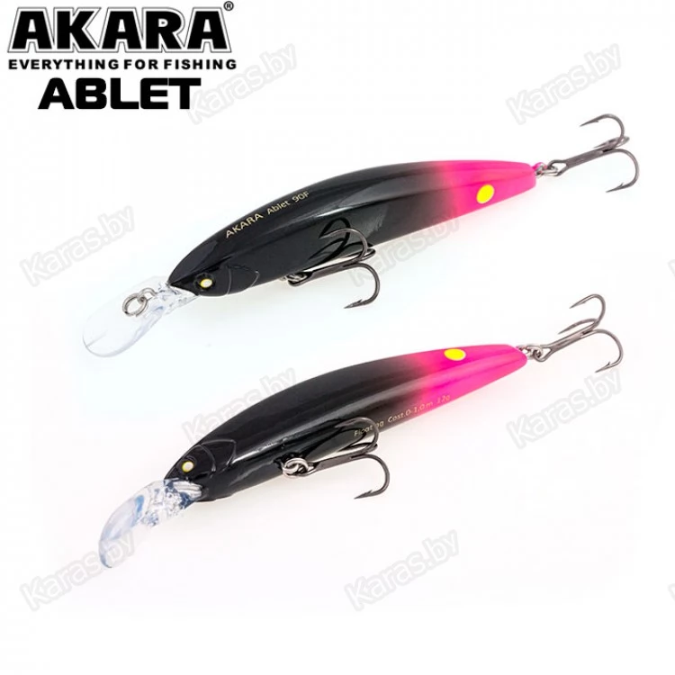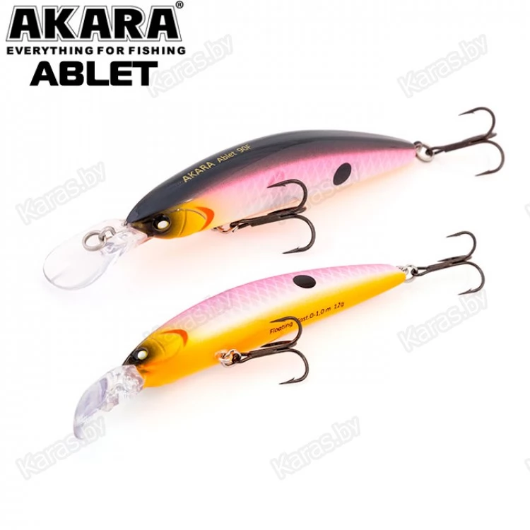 Akara Ablet 90F - плавающий воблер класса Minnow длиной 90мм. Благодаря довольно объемной лопасти имеет привлекательную игру, как на равномерной проводке, так и на рывковой. Воблер оснащен магнитной системой дальнего заброса, не шумящий. Тип плавучести - (F) плавающий. Заглубление при ловле в заброс от 0 до 1,0 м. Оснащен двумя крючками из высокоуглеродистой стали (VMC). Стабильно работает на любых типах водоемов (с течением и без). Плавающий. Заглубление при кастинге 0 до 1,0 м.