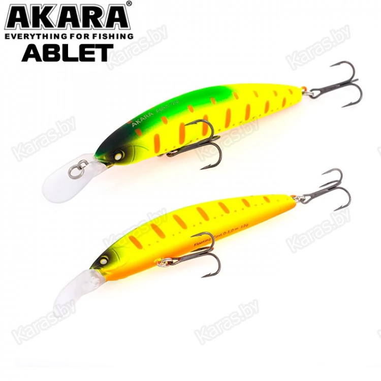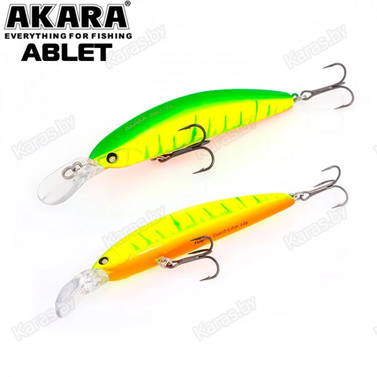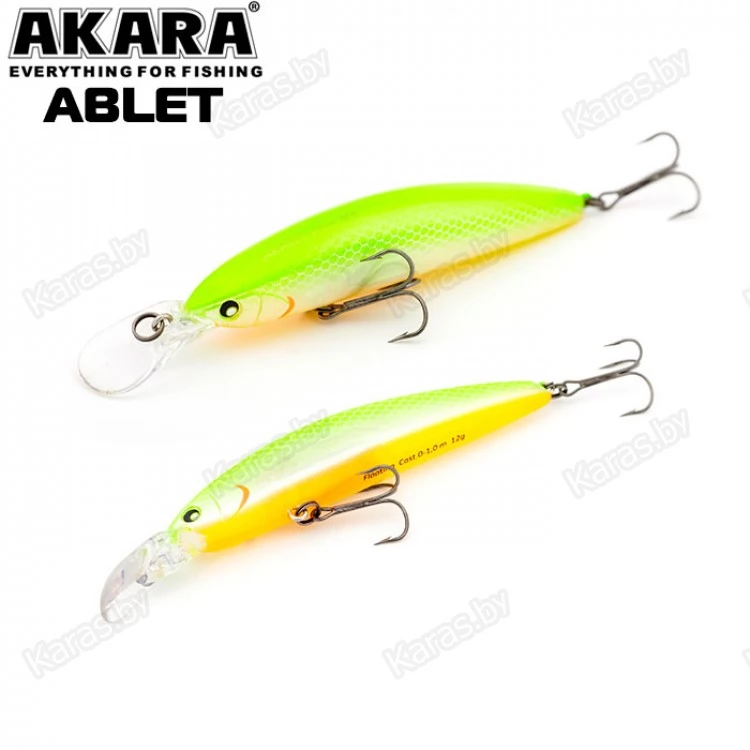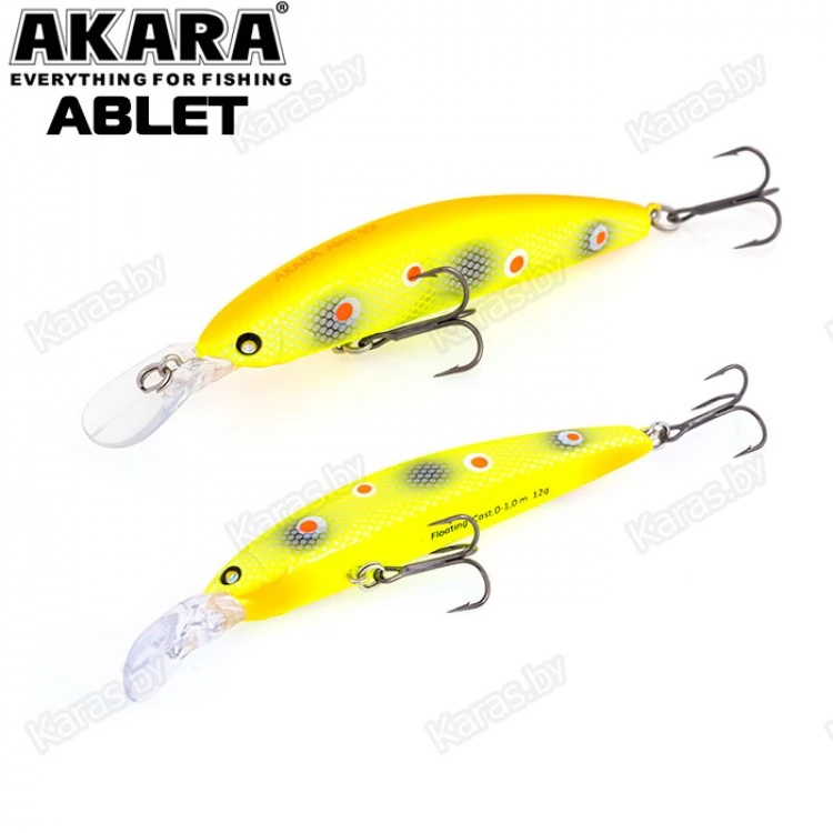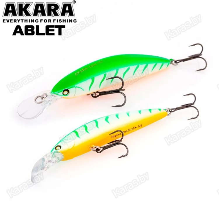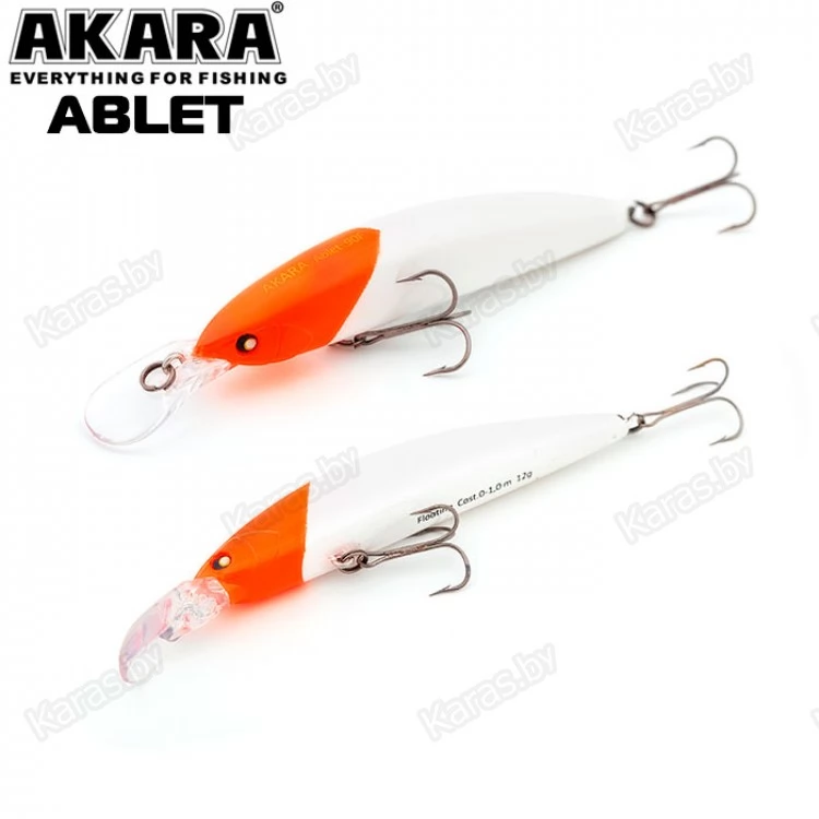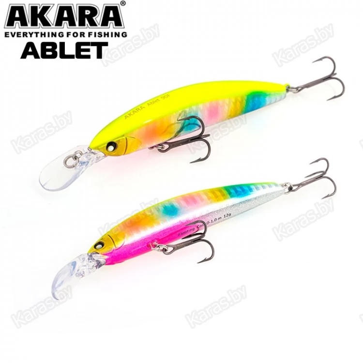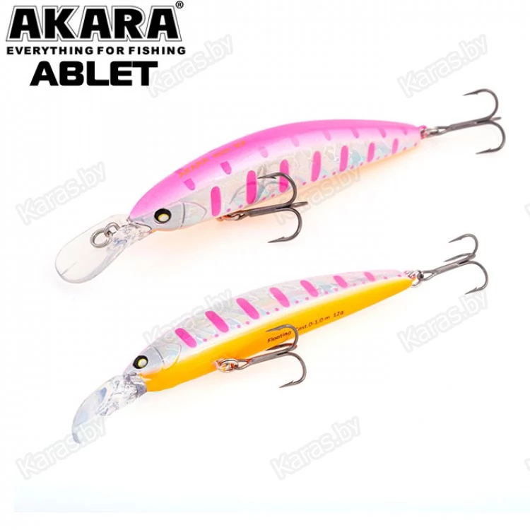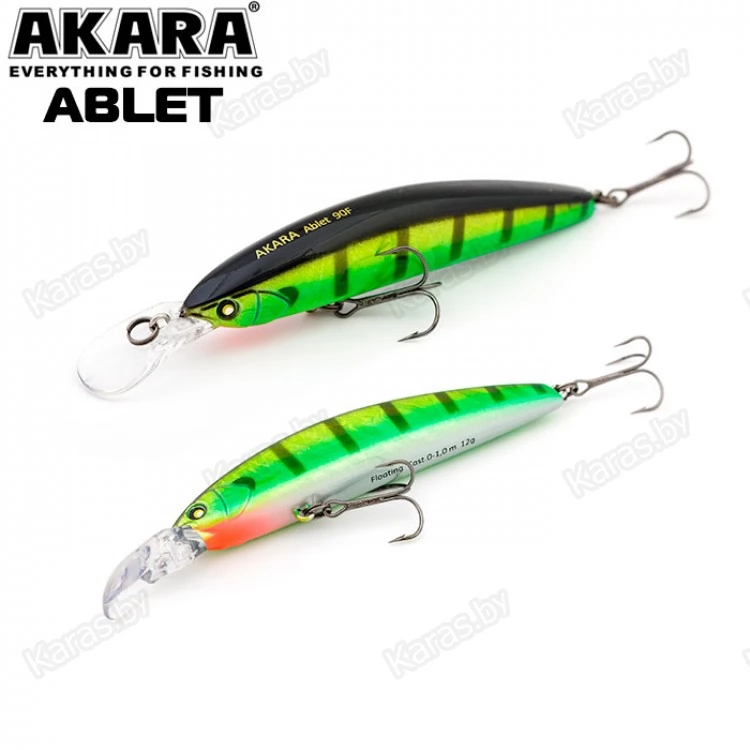 Akara Ablet 90F - плавающий воблер класса Minnow длиной 90мм. Благодаря довольно объемной лопасти имеет привлекательную игру, как на равномерной проводке, так и на рывковой. Воблер оснащен магнитной системой дальнего заброса, не шумящий. Тип плавучести - (F) плавающий. Заглубление при ловле в заброс от 0 до 1,0 м. Оснащен двумя крючками из высокоуглеродистой стали (VMC). Стабильно работает на любых типах водоемов (с течением и без). Плавающий. Заглубление при кастинге 0 до 1,0 м.