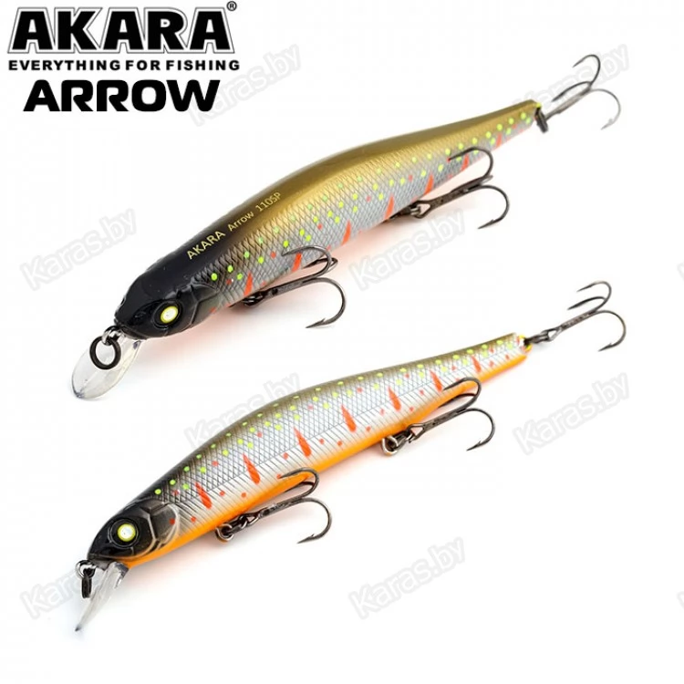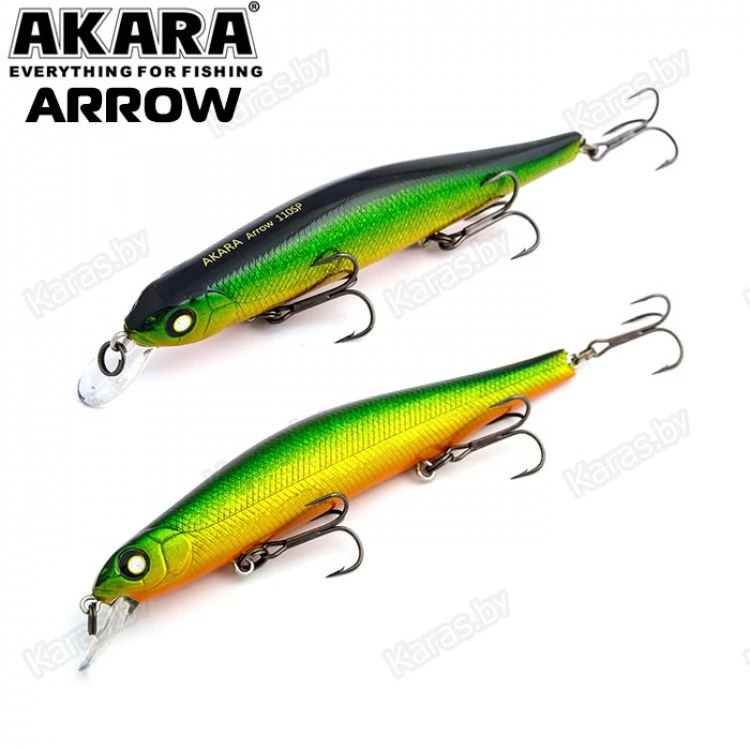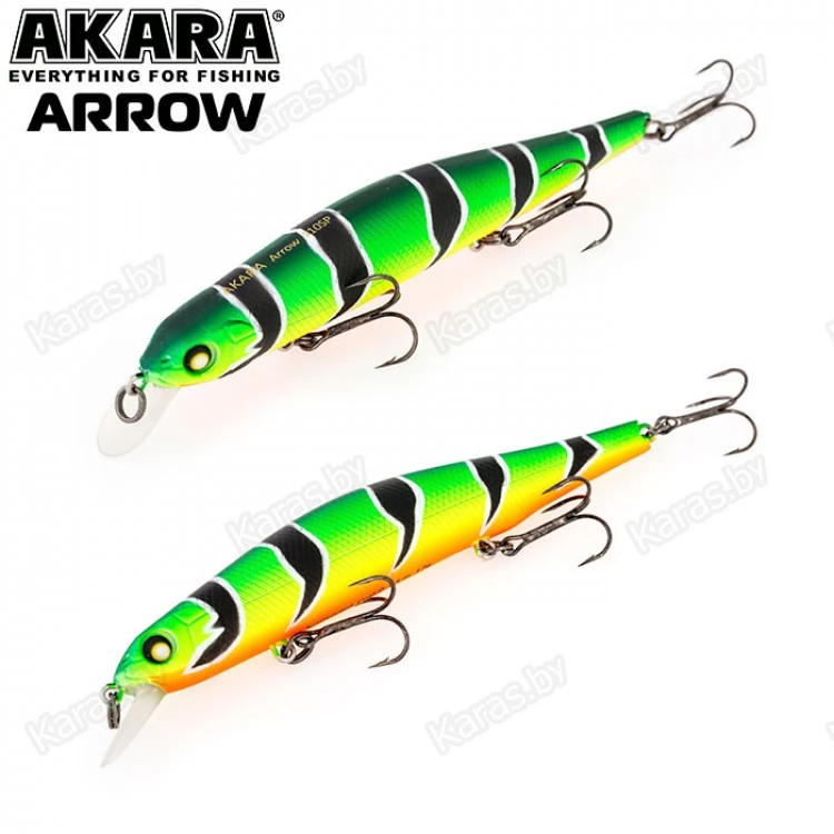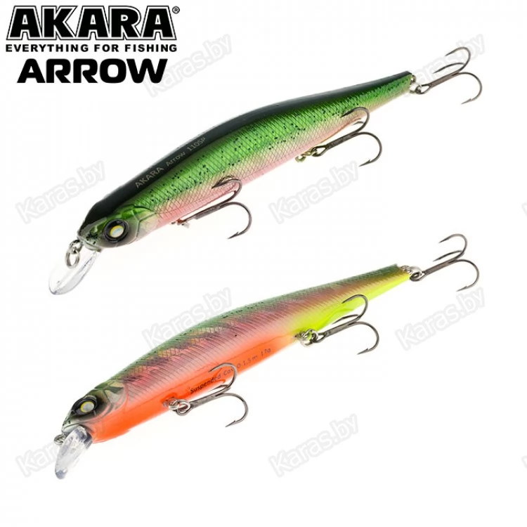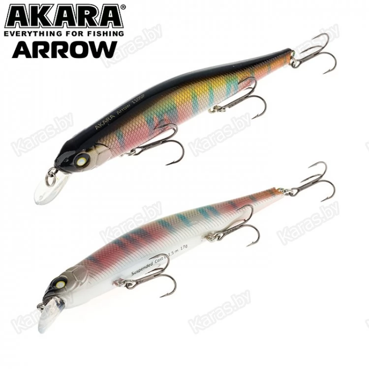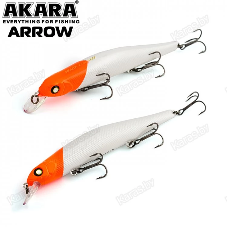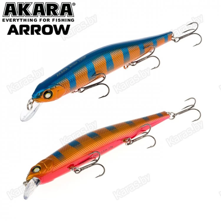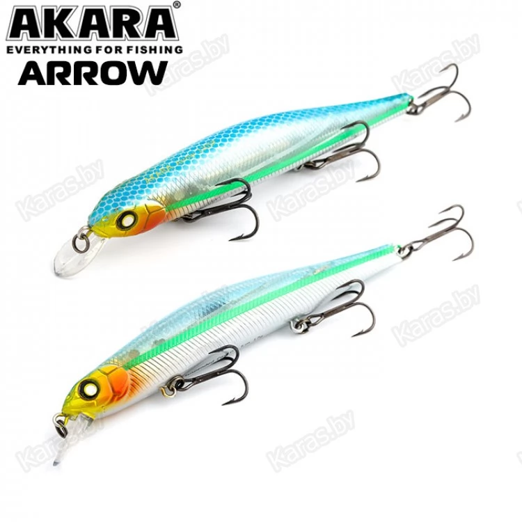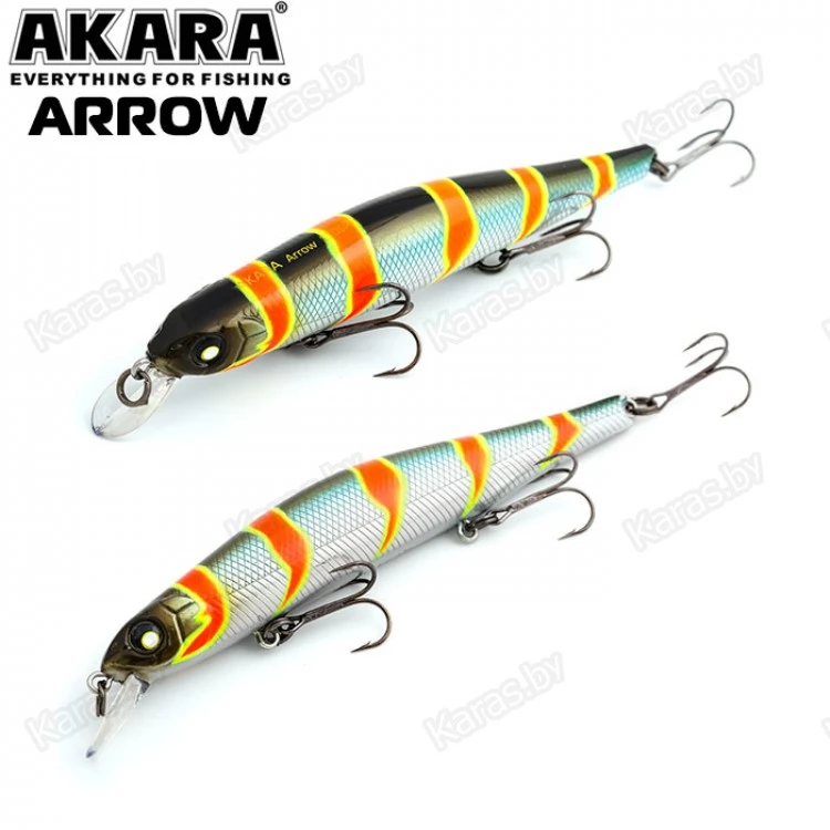 Akara Arrow - воблер суспендер класса минноу. В первую очередь это щучья приманка для ловли методом твичинг, но благодаря своей довольно активной игре на равномерной проводке, её можно с успехом применять для практически всех видов хищных рыб в водоёмах, как с течением, так и без. Благодаря наличию магнитной системы, обладает отменными полётными качествами и отлично держит струю. Подходит для всех видов проводки с использованием его при ловле в заброс. По щуке особенно рекомендуется проводка с использованием 1-3 рывков и паузами в 1-3 секунды. Чем менее активна рыба, тем продолжительнее паузы. С успехом используется для троллинга на малых глубинах и троллинга с использованием даунригера. Основными объектами охоты данной приманки являются: щука, жерех, кумжа, лосось, окунь, судак. Суспендер. Заглубление при кастинге 0,8 до 1,5 м.