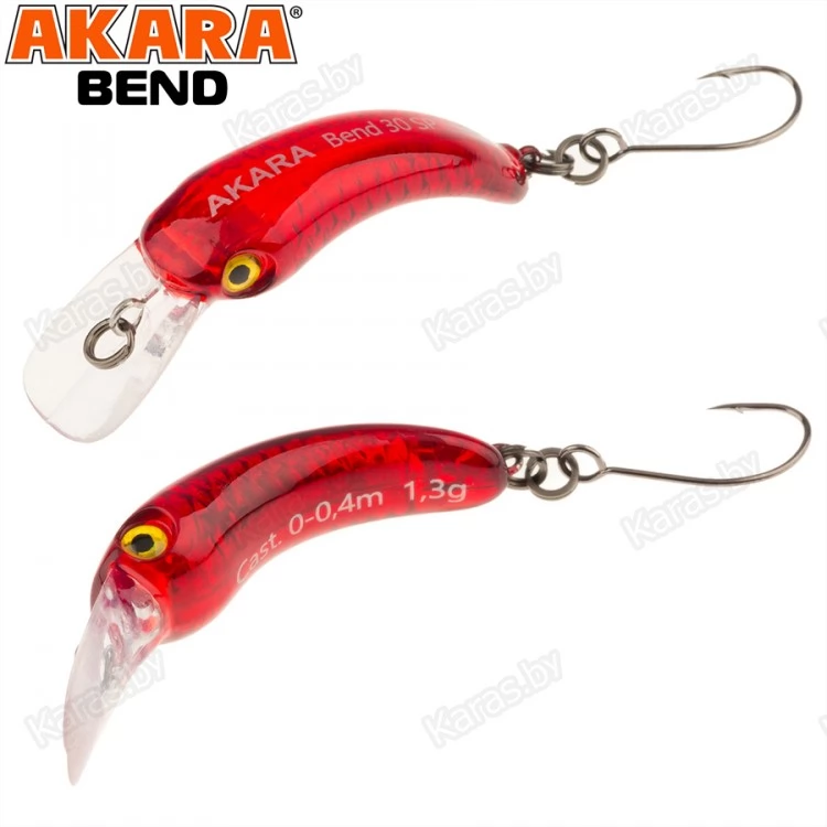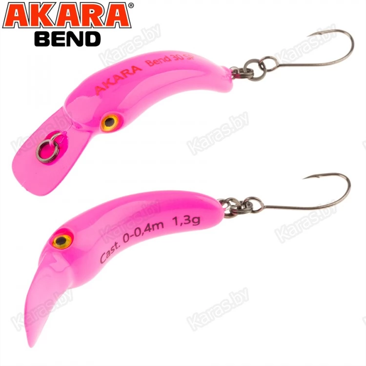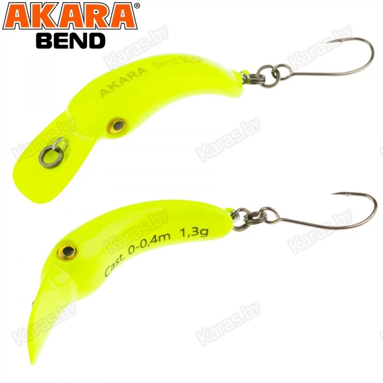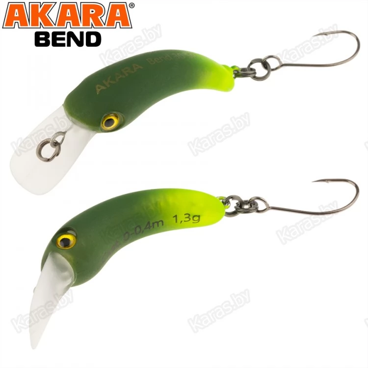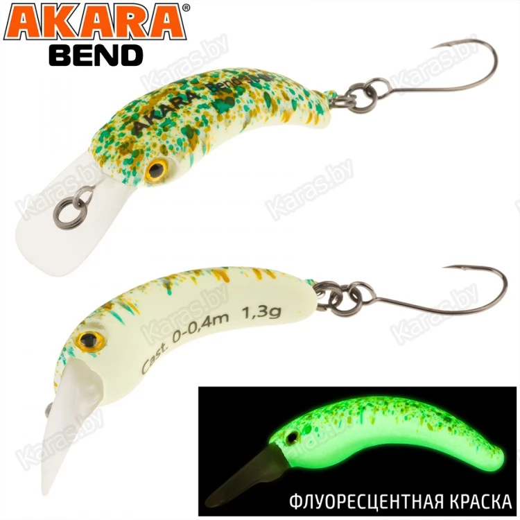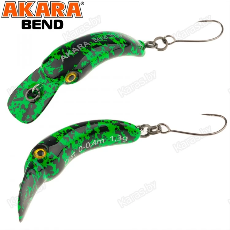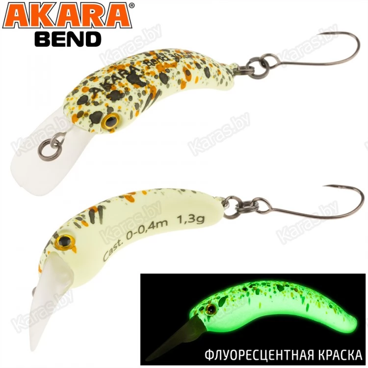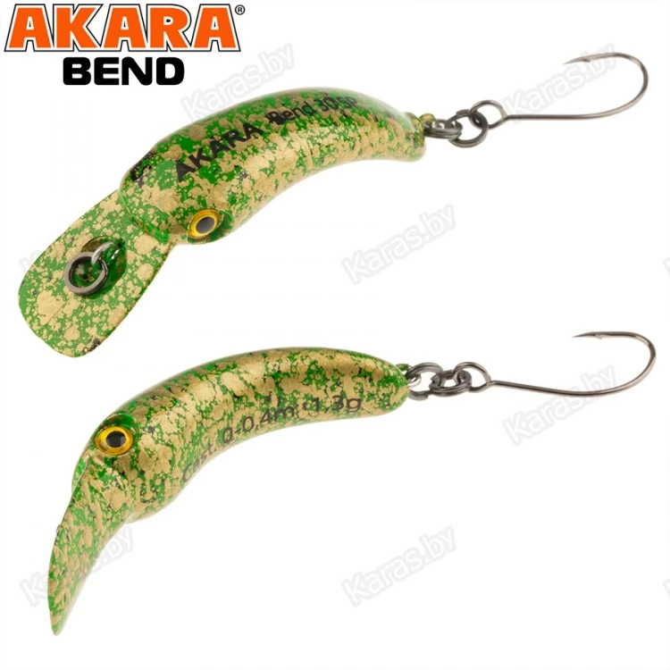 Воблер Akara Bend. Воблеры предназначены для ловли прудовой форели на медленной и очень медленной проводке. Проводить примаку надо с минимальной скоростью при которой она начинает играть. Работает как равномерная проводка, так и проводка с паузами. На паузе приманка медленно тонет или замирает на месте. Заглубление при кастинге 30 мм - 0 до 0,4 м.