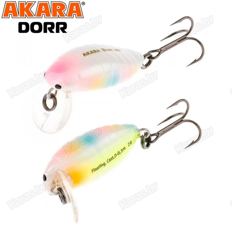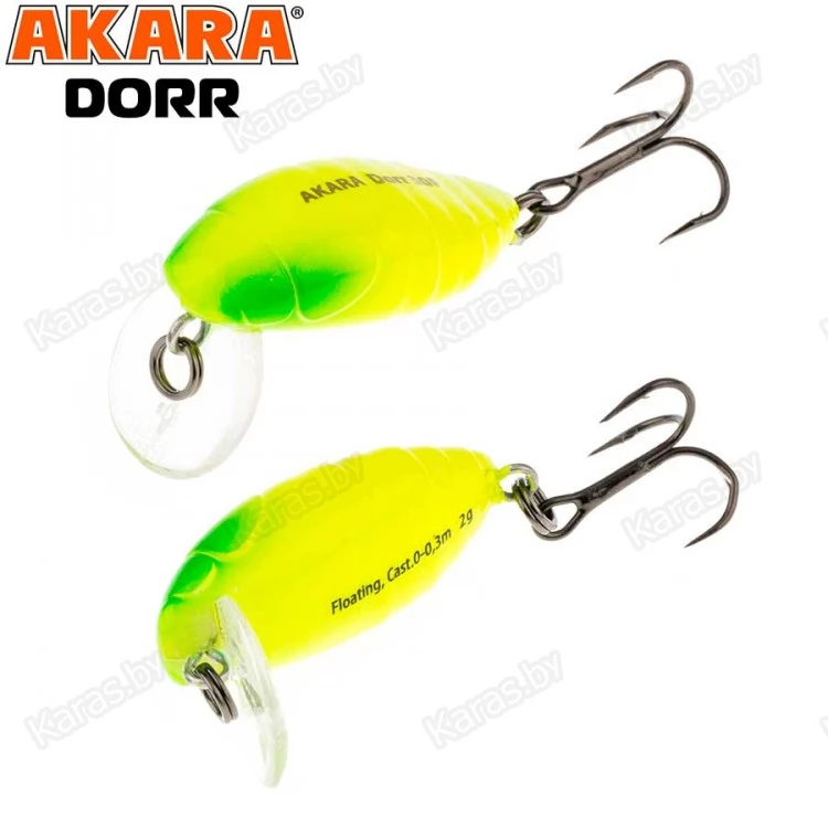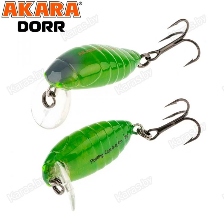 Akara Dorr 30F - небольшой воблер класса ультралайт. Имитирует собой майского жука, в том числе и по этой причине отлично подходит для охоты не только за привычным окунем, но и осторожным голавлем. Хорошо держит струю и не сбивается с игры даже в условиях достаточно сильного потока. Оснащается одним тройником. Плавающий. Заглубление при кастинге до 0,3 м.