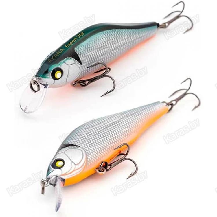 Akara Expert 70F - воблер класса шэд (Shad). Имеет довольно высокое тело, сплюснутое с боков и небольшую лопасть. Обладает активной собственной игрой на равномерной проводке и отлично подходит для рывковой (твичинговой) проводки. Лучше всего проявляет свои уловистые свойства на мелководных реках и озерах, неглубоких участках водохранилищ и крупных рек. Основные трофеи это щука и окунь, но и другие хищные и полухищные рыбы не смогут устоять пред соблазнительной игрой приманки. Воблер Akara Expert 70F оснащен магнитной системой дальнего заброса (Magnetic Cast Sistem MCS). Крючки из высокоуглеродистой стали, тип плавучести – плавающий (Floating). Заглубление от 0 до 1,5м.
