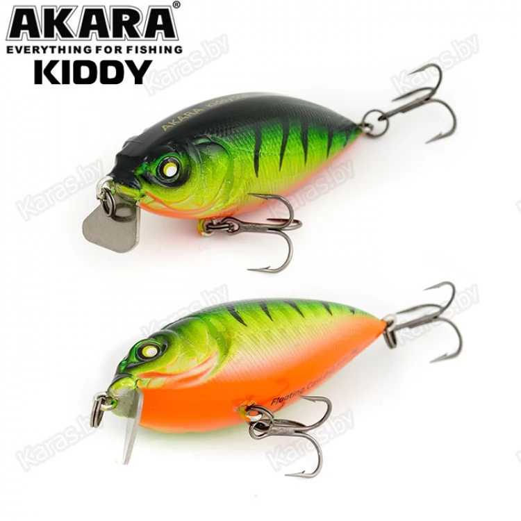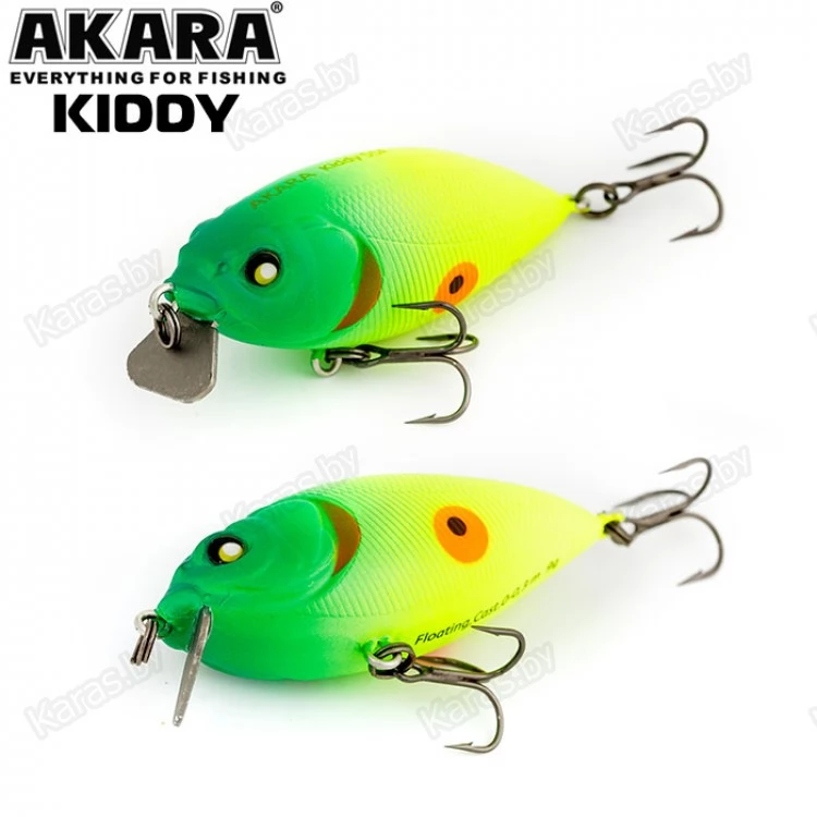 Воблер Akara Kiddy 55F - подповерхностный воблер класса кренк (crank). Его объемное тело в паре с маленькой металлической лопастью создают сильные вибрации во время проводки, игра воблера высокочастотная. В первую очередь применяется для облова мелководий обильно поросших растительностью и закоряженных участков водоемов. Отлично зарекомендовал себя при целенаправленной ловле щуки, а так же окуня и других хищников. Тип плавучести – плавающий (Floating), заглубление от 0 до 0,3 м, слабошумящий, оснащен крючками из высокоуглеродистой стали.