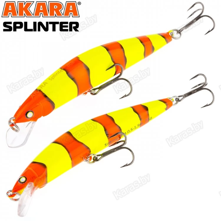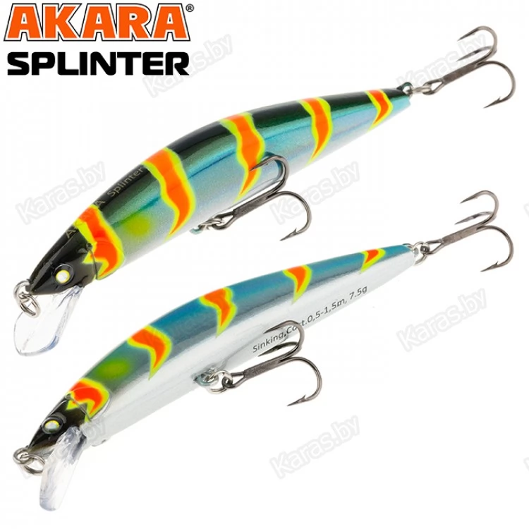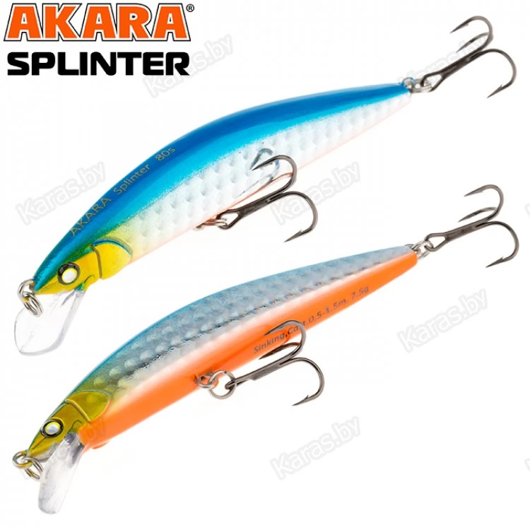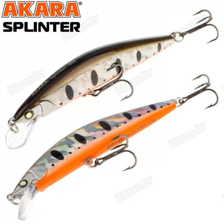 Akara Splinter - воблер класса минноу. Прекрасно подходит для твичинговой ловли. На равномерной проводке, имеет высокочастотную игру, которая отлично провоцирует рыбу к атаке. Благодаря компактной форме и весу, воблер очень хорошо летит, что позволяет осуществлять дальние забросы. Рекомендуется для ловли судака, окуня, щуки и других хищников. Тип плавучести - тонущий (S). Воблеры выполнены в двух размерах: 65мм - 5г, 80мм - 7,5г.