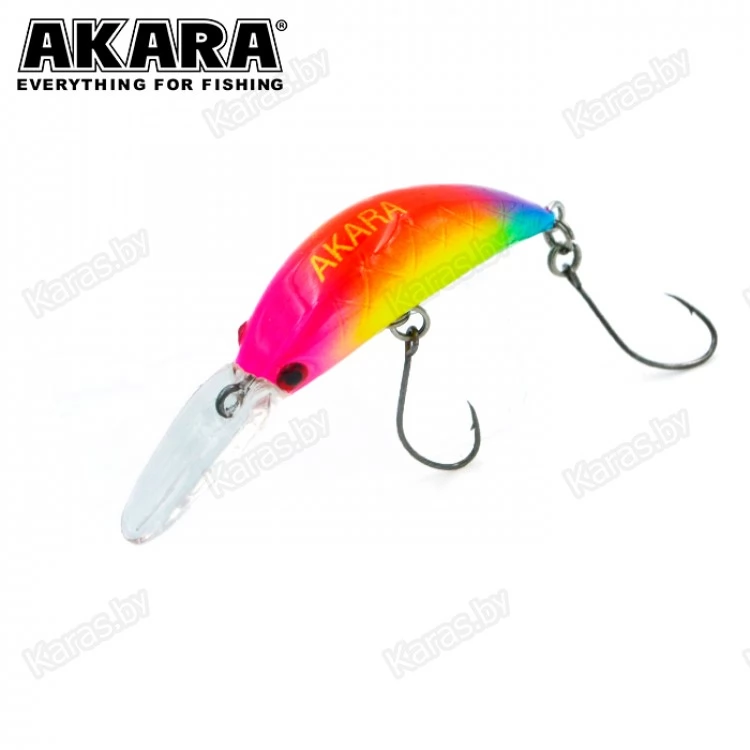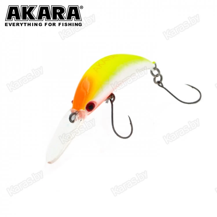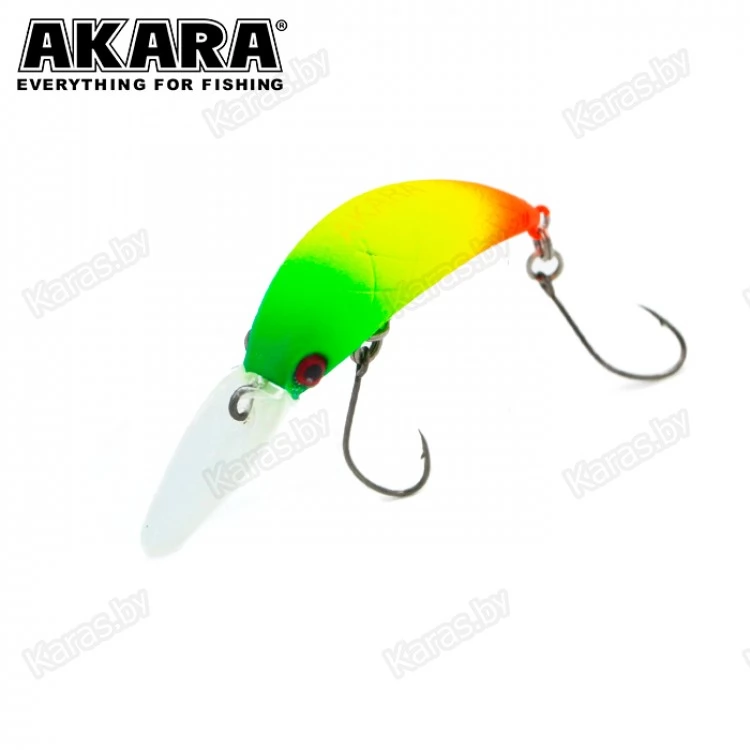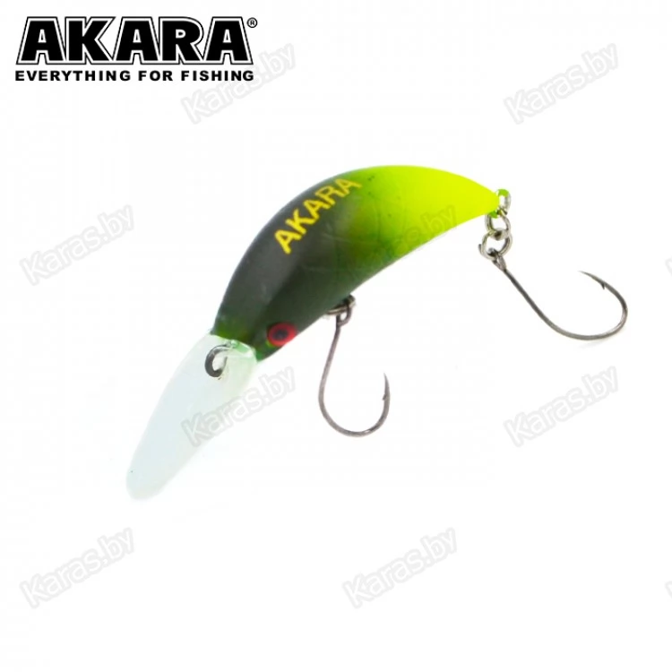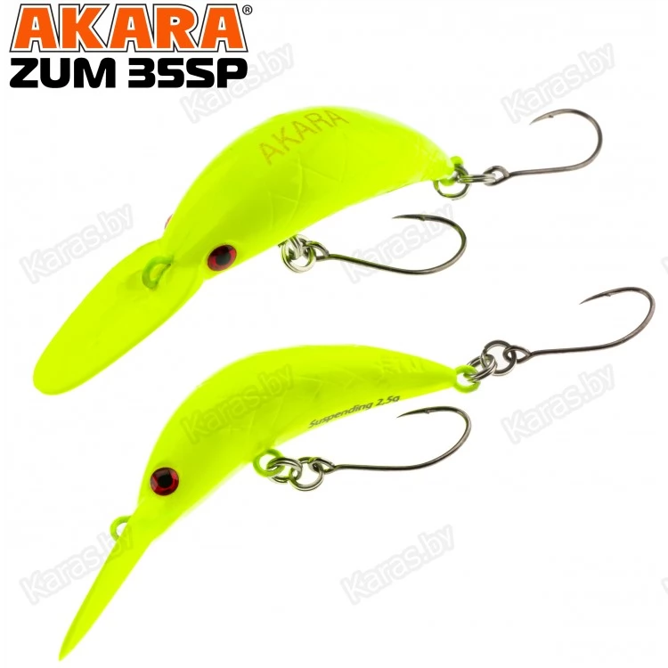Воблер Akara Zum можно назвать старшим братом воблера Akara Bend. Также, как и его младший собрат, он предназначен для ловли прудовой форели в стоячей воде. Воблер обладает нейтральной плавучестью, длина приманки 35 мм и вес 2.5 грамма. При таких габаритах воблер обладает отличными полётными характеристиками, ярко выраженной активной игрой и начинает работать даже при минимальной скорости проводки. Воблер отлично работает как на равномерной проводке, так и на лёгком твичинге и проводке stop-and-go. Оснащён качественной фурнитурой и острыми, прочными крючками.