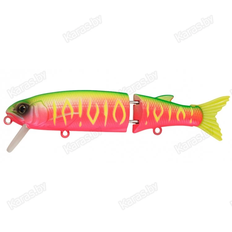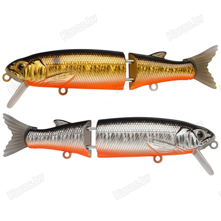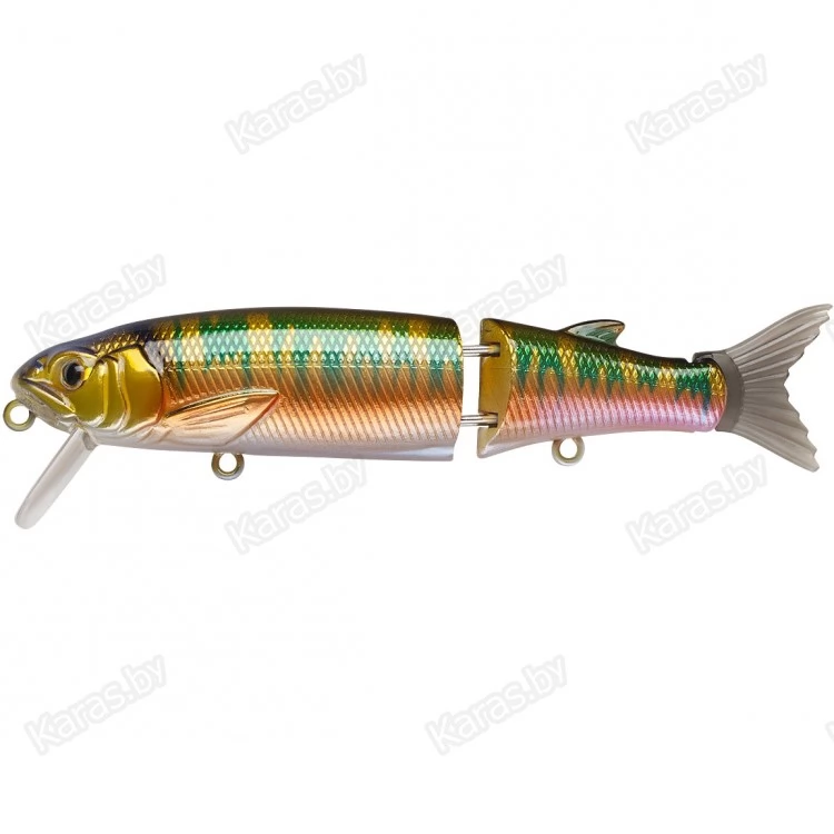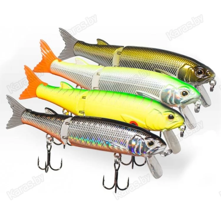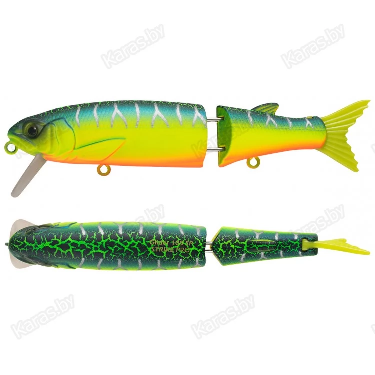 Воблер Strike Pro Glider 90 - двухсекционный составник с длинным, овальным в сечении телом и обводами напоминающий минноу. Секции стыкуются шарнирным соединением, которое обеспечивает подвижность необходимую для активной игры. Внутри передней секции расположена фиксированная огрузка и шумовая камера. Внешний вид хвостовой секции дополнен небольшим плавничком и съемным эластичным хвостом. При изнашивании последний может быть заменен запасным плавником зеленого, белого, красного или синего цвета.