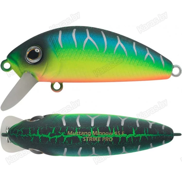 Воблер Strike Pro Mustang Minnow 45 – вторая по компактности модель в мустанговой серии. Относится к окуневым ультралайтовым приманкам. Эта версия выполнена в медленно тонущем варианте, заглубляется при равномерной анимации до полуметра. Вытянутое и упитанное, веретенообразное тело сочетает выраженные черты минноу, признаки фета и кренка. Короткая, но большая по площади лопасть отклоняется от оси примерно на 50° и имеет усиленное основание. Монтажная петелька снабжена крепким заводным колечком и установлена с наклоном в носовой части приманки.