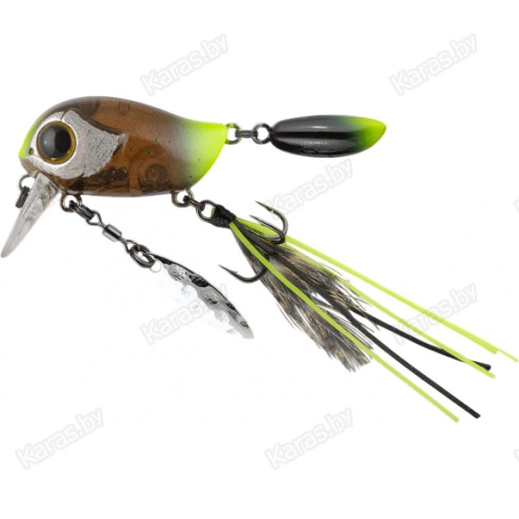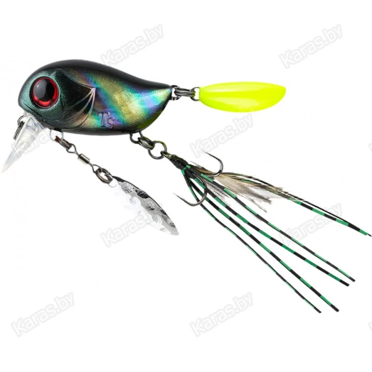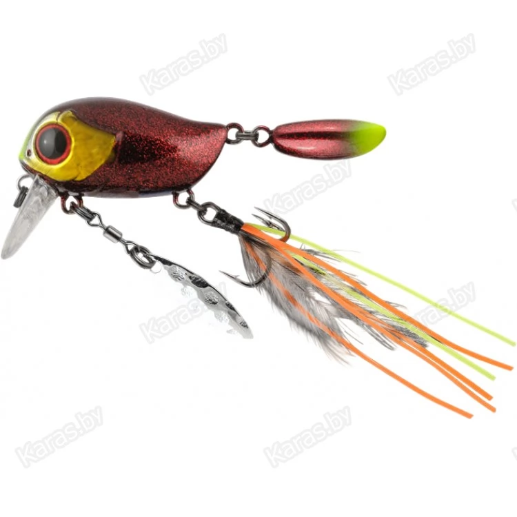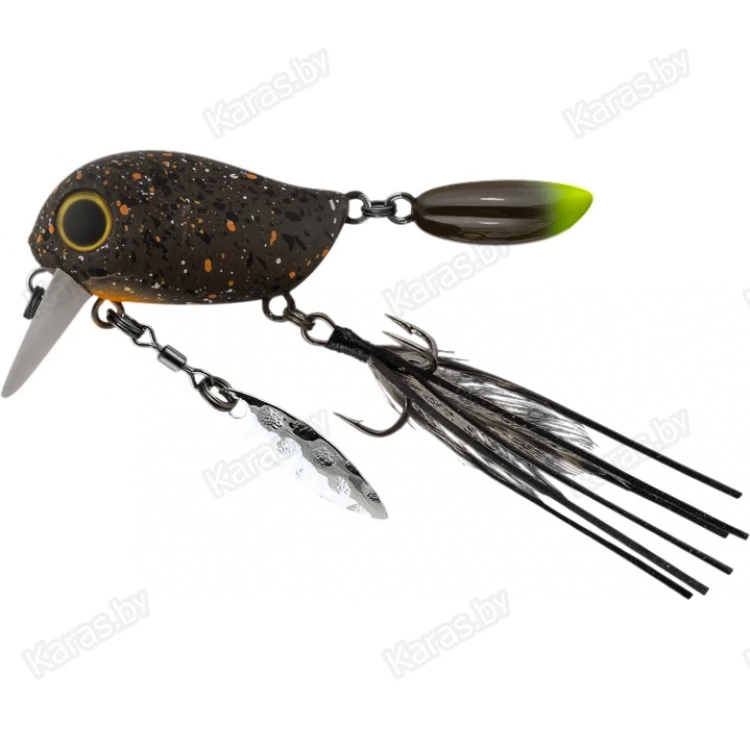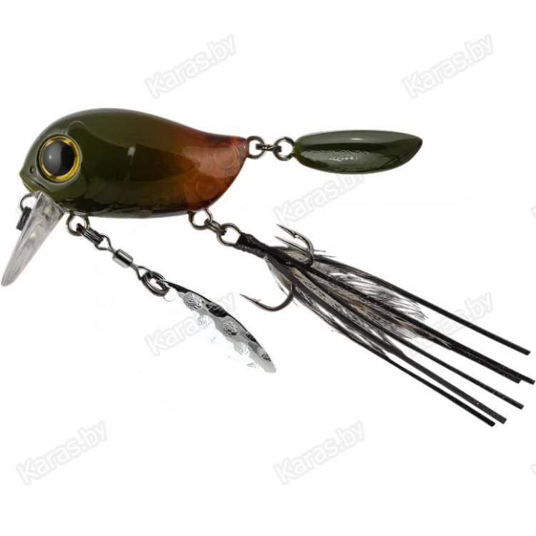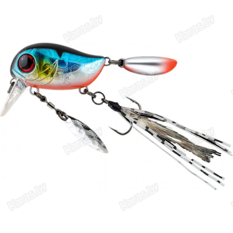 Особенности дизайна: KIKI 54F не похож на остальные воблеры-кренки, поскольку имеет в своей конструкции ряд оригинальных дополнительных элементов, призванных привлечь внимание хищной рыбы. Под брюшком у приманки находится подвижный металлический лепесток, который вращается при проводке, в задней части – жесткий пластиковый хвостик, который при движении в воде колеблется из стороны в сторону, а единственный тройник воблера оснащён мушкой из перьев и довольно длинных силиконовых нитей. Головная часть KIKI 54F рельефно имитирует жаберные крышки, а вклеенные объемные 3D глаза завершают реалистичный дизайн приманки.