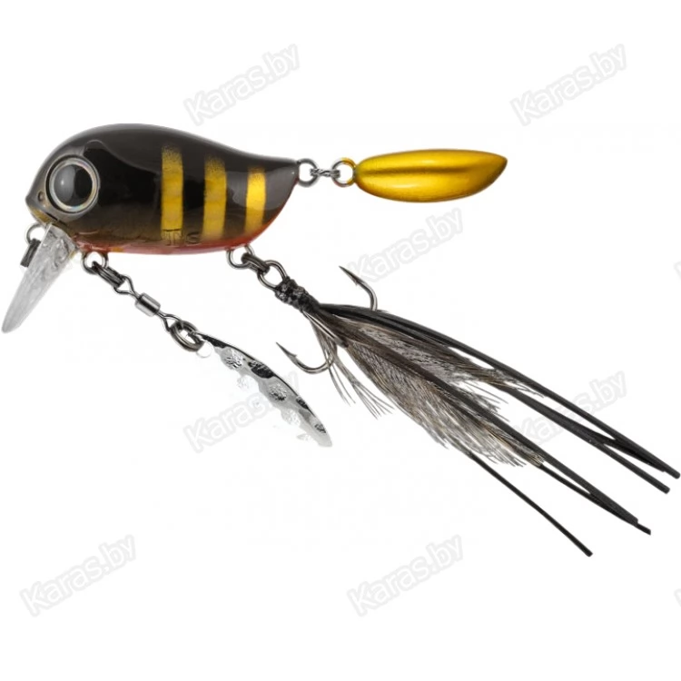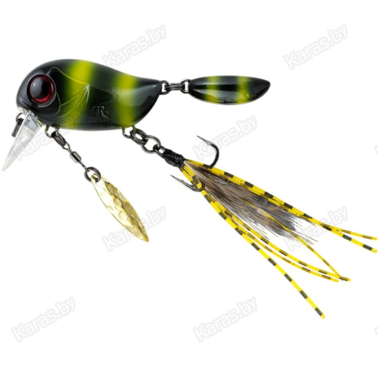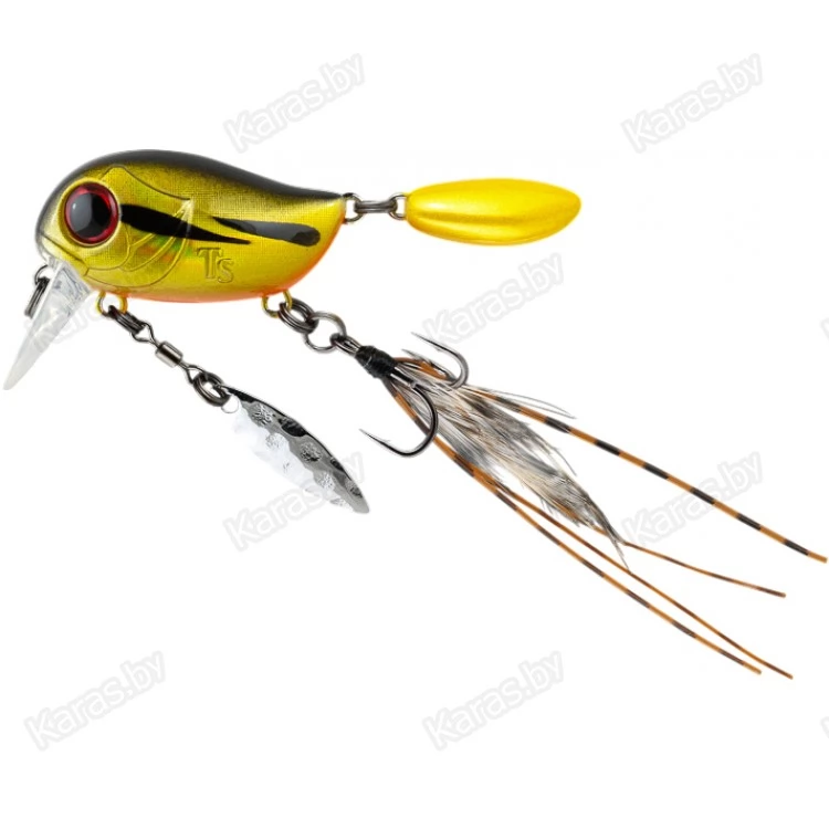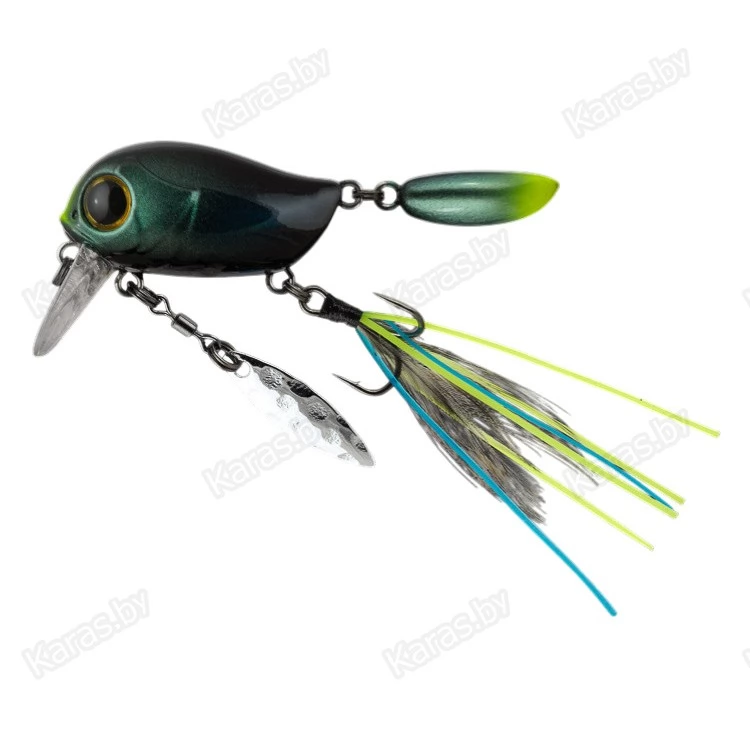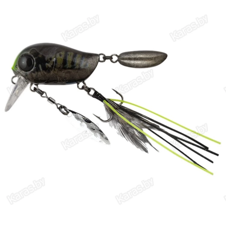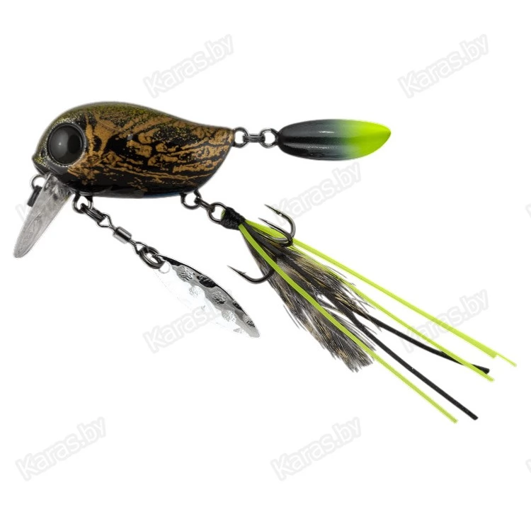 Особенности дизайна: KIKI 54F не похож на остальные воблеры-кренки, поскольку имеет в своей конструкции ряд оригинальных дополнительных элементов, призванных привлечь внимание хищной рыбы. Под брюшком у приманки находится подвижный металлический лепесток, который вращается при проводке, в задней части – жесткий пластиковый хвостик, который при движении в воде колеблется из стороны в сторону, а единственный тройник воблера оснащён мушкой из перьев и довольно длинных силиконовых нитей. Головная часть KIKI 54F рельефно имитирует жаберные крышки, а вклеенные объемные 3D глаза завершают реалистичный дизайн приманки.