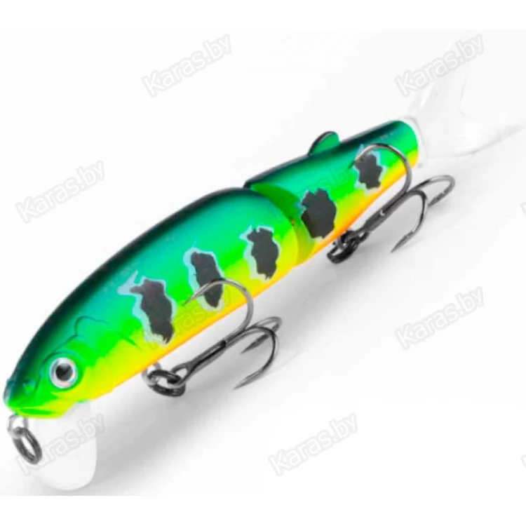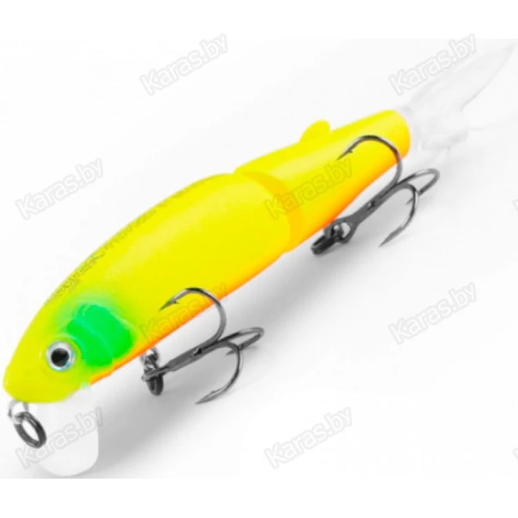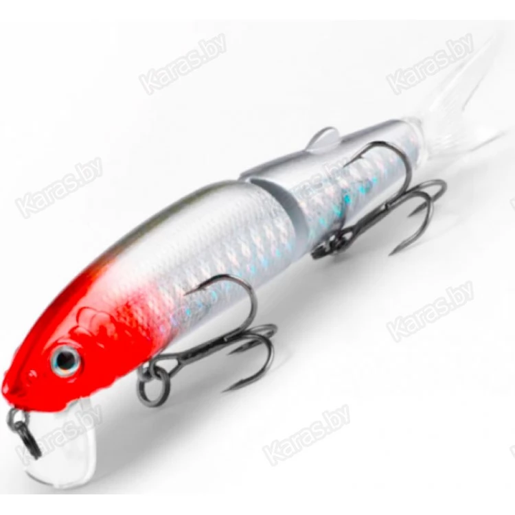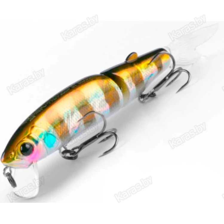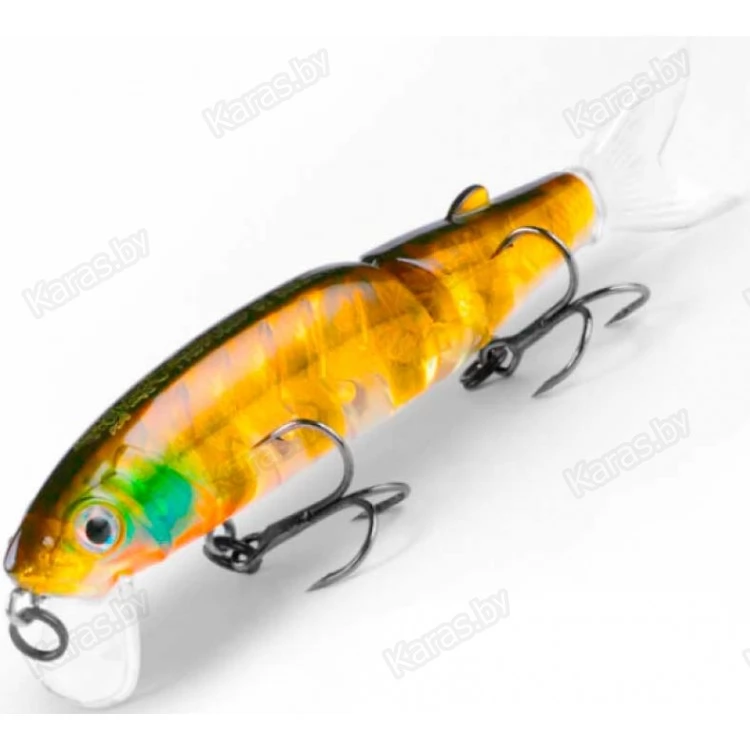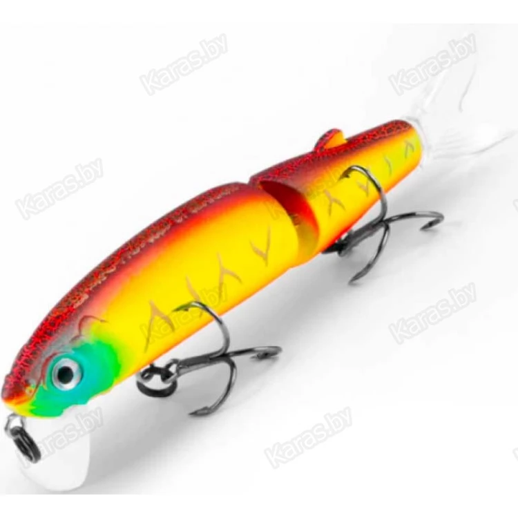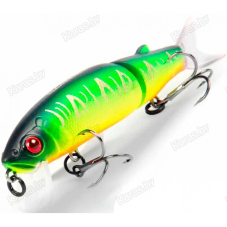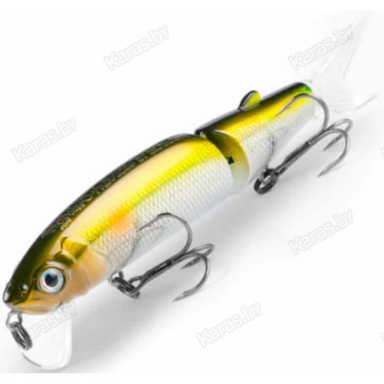 Приманка состоит из двух частей, каждая из которых подвижна. Так же в комплект входят два силиконовых хвостика. Тип воблера – минноу. Длина приманки - 113 мм. Вес - 13.7 грамм. Заглубление 0,1-0,5 м. Размер приманки супер универсальный, отлично подойдет как для щуки, так и для другой хищной рыбы. Копия проста в использовании, не требовательна к строю спиннинга и навыкам рыболова. Идеально работает в окнах кувшинки и над травой на мелководье. Работает полный сезон открытой воды.