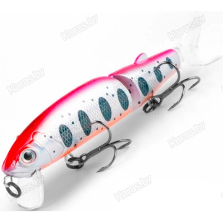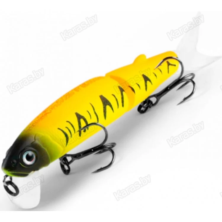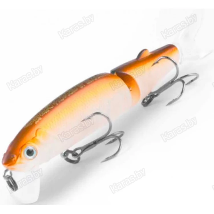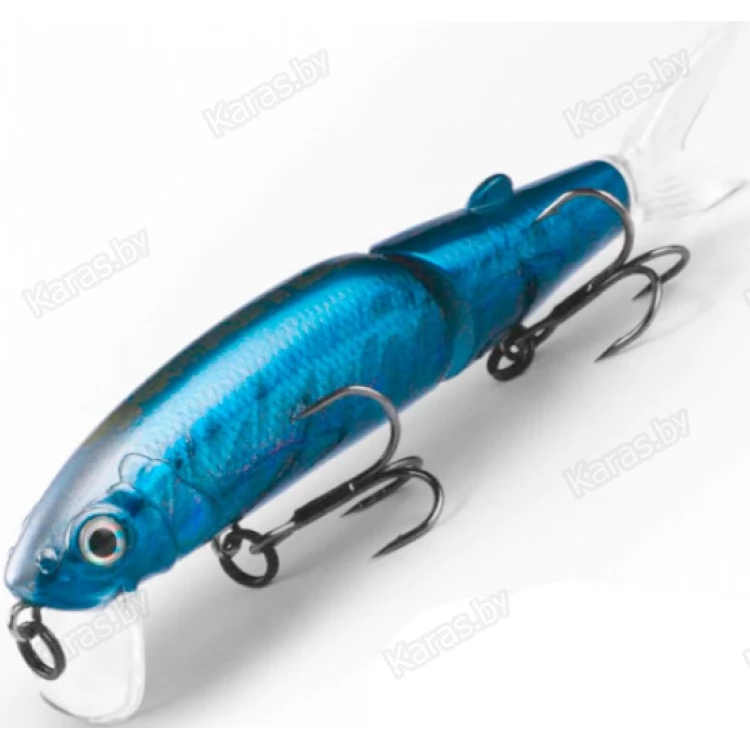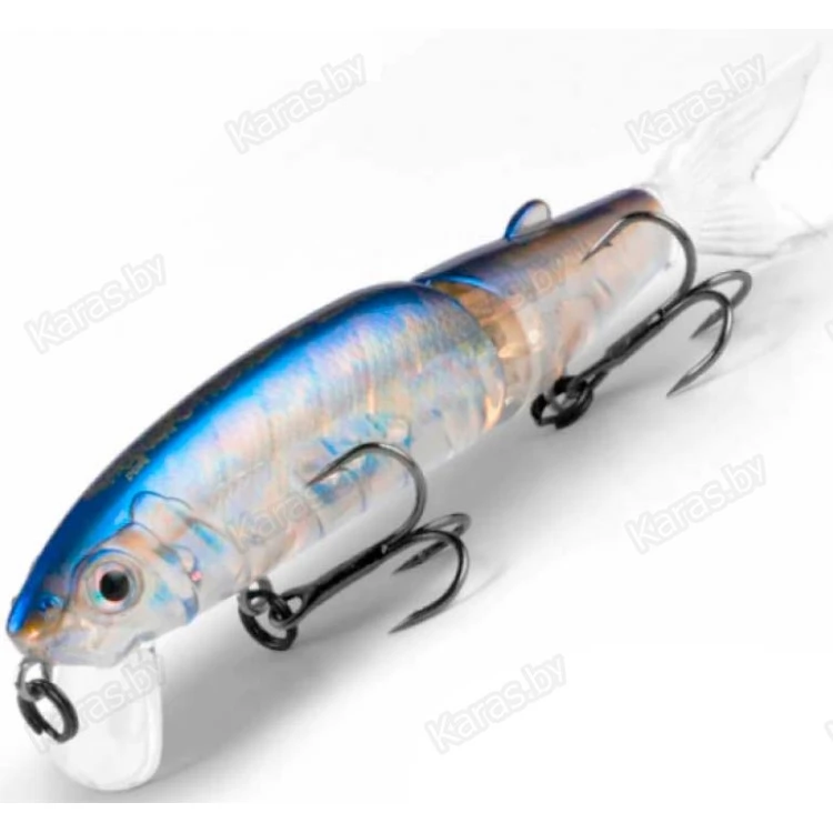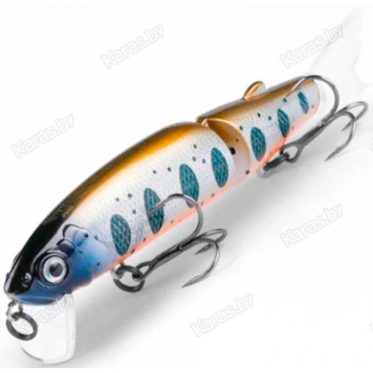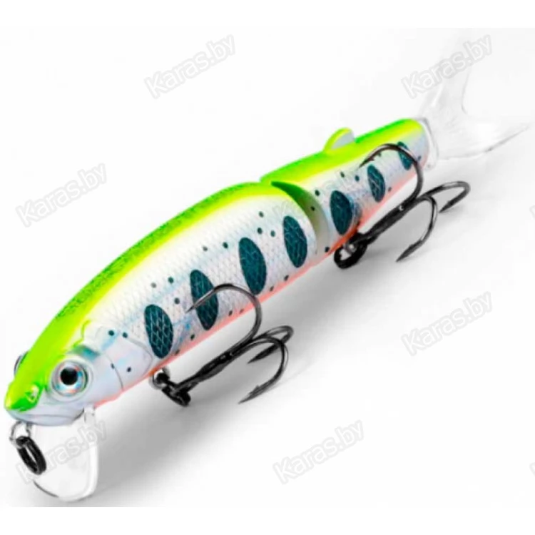 Приманка состоит из двух частей, каждая из которых подвижна. Так же в комплект входят два силиконовых хвостика. Тип воблера – минноу. Длина приманки - 113 мм. Вес - 13.7 грамм. Заглубление 0,1-0,5 м. Размер приманки супер универсальный, отлично подойдет как для щуки, так и для другой хищной рыбы. Копия проста в использовании, не требовательна к строю спиннинга и навыкам рыболова. Идеально работает в окнах кувшинки и над травой на мелководье. Работает полный сезон открытой воды.