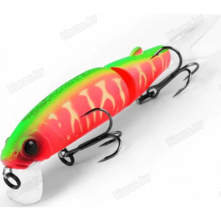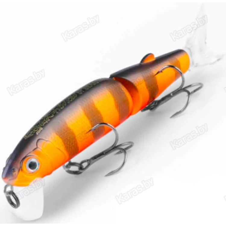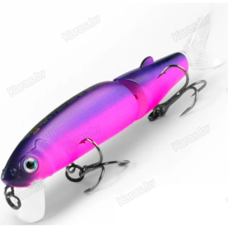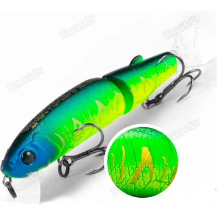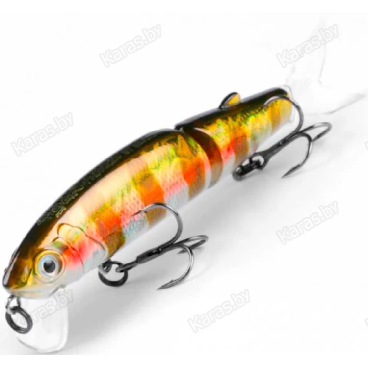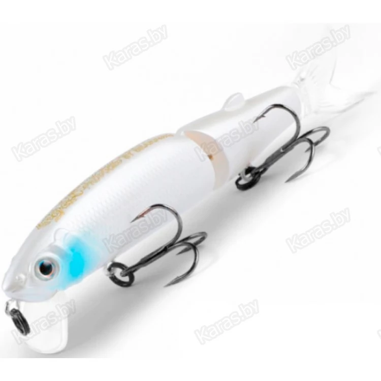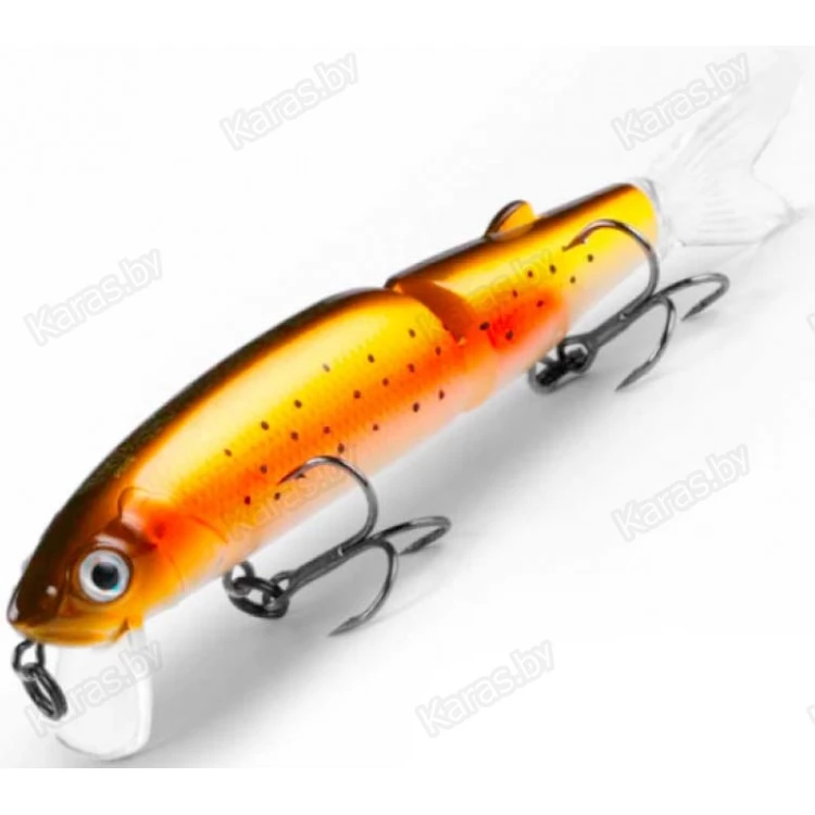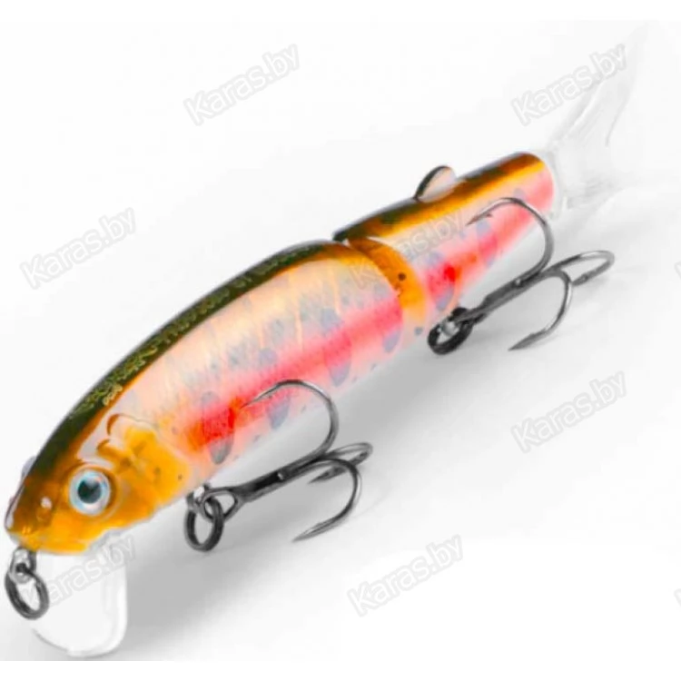 Приманка состоит из двух частей, каждая из которых подвижна. Так же в комплект входят два силиконовых хвостика. Тип воблера – минноу. Длина приманки - 113 мм. Вес - 13.7 грамм. Заглубление 0,1-0,5 м. Размер приманки супер универсальный, отлично подойдет как для щуки, так и для другой хищной рыбы. Копия проста в использовании, не требовательна к строю спиннинга и навыкам рыболова. Идеально работает в окнах кувшинки и над травой на мелководье. Работает полный сезон открытой воды.