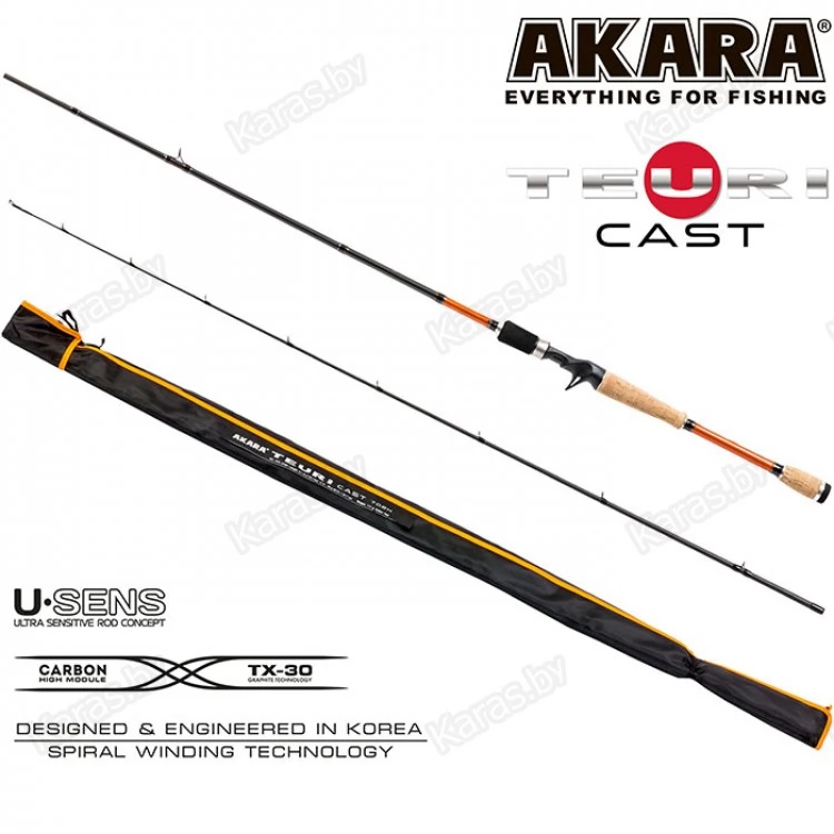 Akara Teuri Cast H – спиннинг штекерный (2 – ух составной) для ловли с мультипликаторной катушкой. Новинка 2019 года в обновленной линейке спиннингов Akara Teuri. Бланк спиннинга изготовлен по новейшим технологиям из графита концерна Toray TX-30 (40-ton). Благодаря инновационным технологиям плетения бланка спиннинг обладает повышенной чувствительностью при проводке, что делает его незаменимым при контактных видах ловли: джиг, твич, ловля на техасскую оснастку и с отводным поводком. При производстве бланка спиннинга использована технология UPIT. Расстановка колец произведена по технологии New Guide System, позволяющая оптимально расположить кольца на бланке, определить их количество и размер (вес). Облегчённые кольца Kujira XR Long Super Hard ZrO2 (1600-1800H, kg/mm2).
