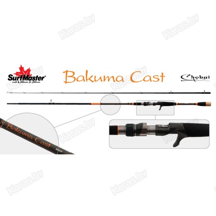 Мощное джерковое удилище Bakuma Cast – универсальный кастинговый спиннинг для контактных видов ловли: heavy джиг, light джерк, твич. Преймущества джеркового удилища Surf Master Bakuma: позволяет применять тяжелые и объемные приманки., сбалансированный бланк из высокомодульного карбона быстрого строя, позволяет выполнять точные и дальние забросы. выдерживает повышенные нагрузки, позволяет рыбачить «через траву» и справиться с рыбой любого размера., оснащается низкопрофильными облегченными усиленными пропускными кольцами Kujira XR  для ловли с прочными плетенными шнурами., нагрузка на бланк оптимально распределена, благодаря растановки колец по технологии New Guide System. Сохраняется высокая чувствительность при проводке. эргономичная неопреновая рукоять обеспечивает надежный хват, что важно в борьбе с трофеями.