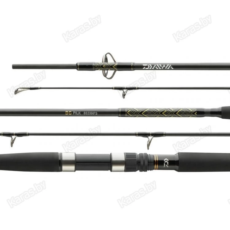 Специально для серии катушек BG, Daiwa разработала небольшую серию удилищ для джиговой ловли с лодки Балтийском и Норвежском море. Эти удилища отличаются активной вершинкой и мощным бланком - идеально для ловли на пилькеры и мягкие приманки. Бланки прекрасно амортизируют рывки трески, сайды и палтуса. Катушкодержатель оснащен двумя винтами, что позволяет надежно зафиксировать катушку. Оригинальная оплетка комеля черно-золотого цвета является логическим завершением утонченного дизайна удилища. Сделано из высокомодульного графита, оснащено кольцами из оксида титана на двойной ножке, рукояткой EVA и украшено высококлассной оплеткой.