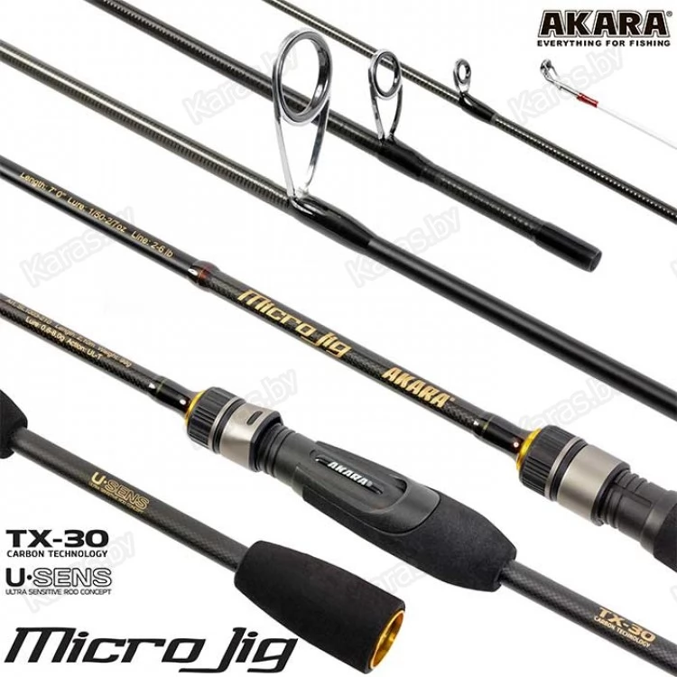Топ 3 спиннинг для микроджига по рейтингу рыбаков России. Изготовлен по современным технологиям увеличивающим эффективность джиговых проводок.  Бланк Akara Micro Jig выполнен из уникального компонента TX-30 методом горячего накатывания в вакуумной камере. Очень чувствительное угольное штекерное удилище магическим способом увеличит улов и доставит огромное удовольствие любителям микроджига. Akara Micro Jig TX-30 Данный микроджиговый спиннинг поставляется в трех длинах 2, 2.1, и 2.3 метра с тестом 0.6 до 8 грамм.