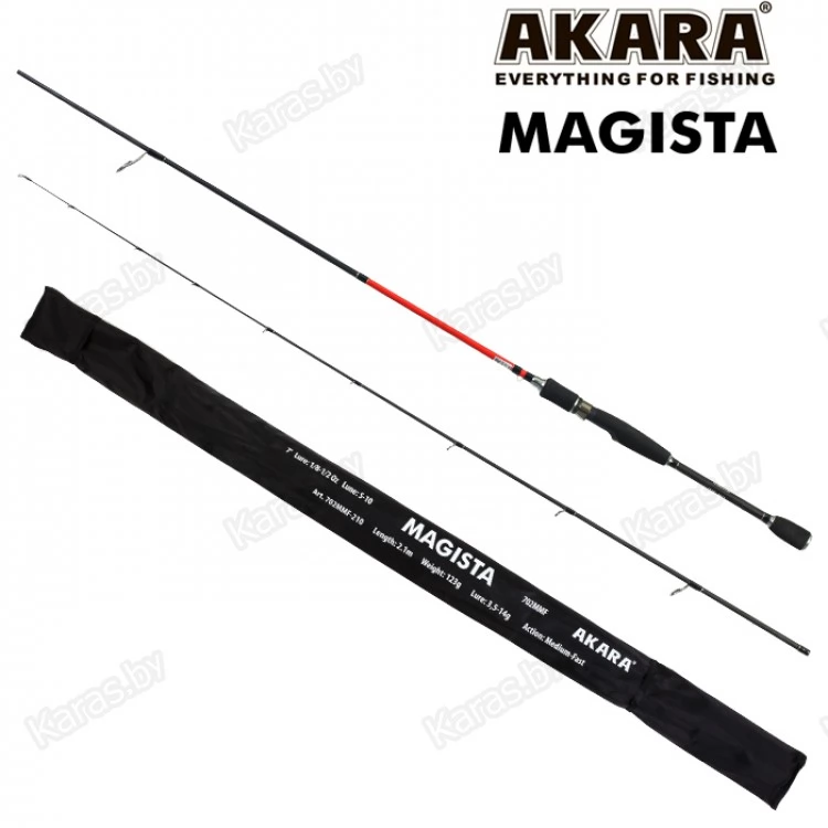 Akara Magista MLMF - чувствительный на поклевке и отзывчивый на проводке солид спиннинг с бланком средне-быстрого строя. Таких характеристик удалось добиться благодаря использованию при его производстве технологии U-SENS (бланк спекается при помощи высокомолекулярной порошковой смолы, количество связующего вещества при этом удается снизить на четверть). А так же специальной геометрии бланка. Смягченный средне-быстрый строй при таком тесте делает этот спиннинг универсальным по видам ловли и диапазону использования приманок. Обладая хорошими бросковыми характеристиками, с успехом используется для ловли на мелкие воблеры, для ловли твичингом и равномерной проводки. Хорошо зарекомендовал себя при ловле на мелкие вертушки, не мелкой рыбы: голавля, форели, хариуса, язя и других осторожных хищников. Может использоваться для ловли на лайт-джиг, интересен при ловле на отведенный поводок.