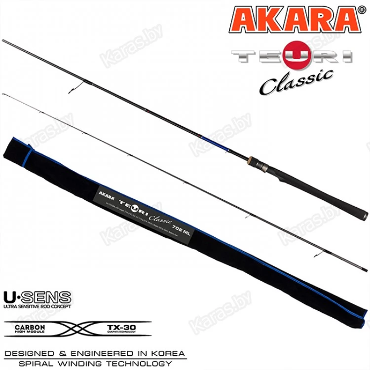 Спиннинги Akara Teuri Classic - это широкая линейка удилищ для самых разных условий ловли. Данные спиннинги собраны на основе бланка из высокомодульного карбона TX-30 (40-ton) производства Японского концерна Toray. При производстве используется современная технология UPIT (Under Pressure Innovative Technology) при которой бланк спиннинга накатывается под давлением в термической камере. Использование данной технологии позволяет создать бланки с минимальным количеством связующего вещества и высокой плотности скручивания.