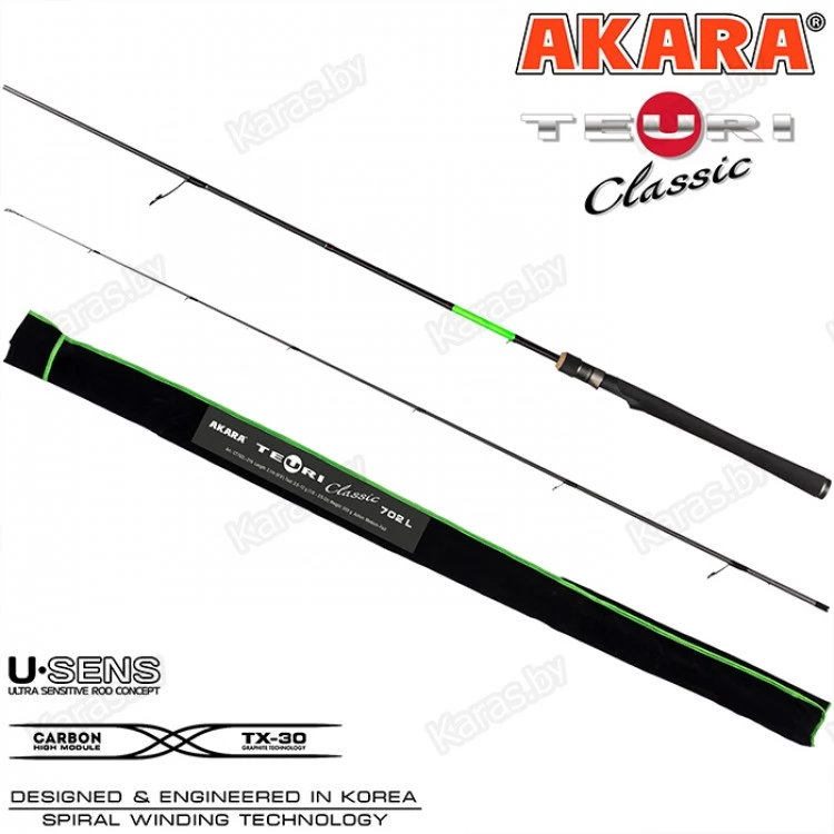 Спиннинги Akara Teuri Classic - это широкая линейка удилищ для самых разных условий ловли. Данные спиннинги собраны на основе бланка из высокомодульного карбона TX-30 (40-ton) производства Японского концерна Toray. При производстве используется современная технология UPIT (Under Pressure Innovative Technology) при которой бланк спиннинга накатывается под давлением в термической камере. Использование данной технологии позволяет создать бланки с минимальным количеством связующего вещества и высокой плотности скручивания.