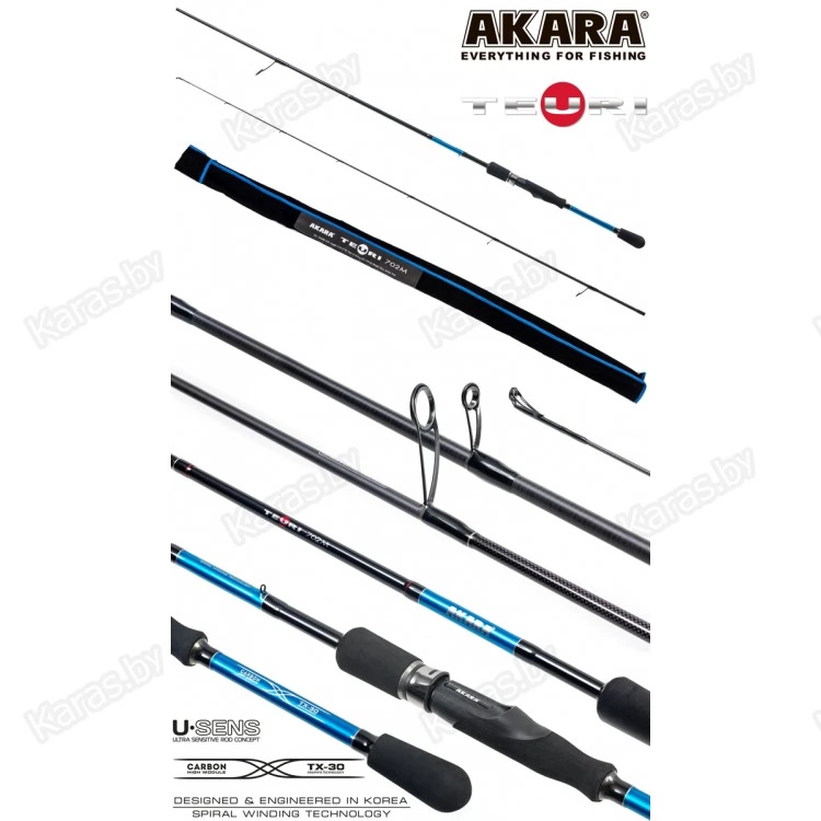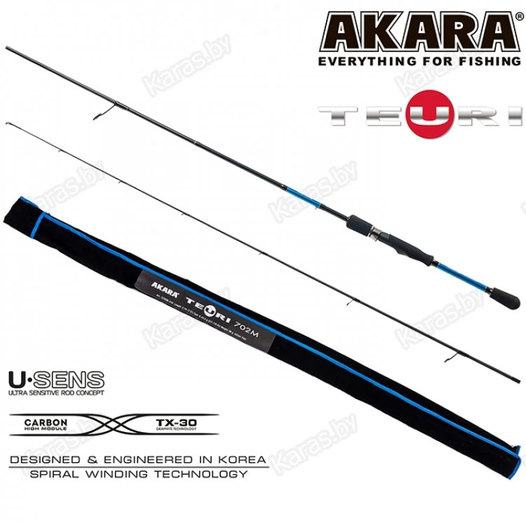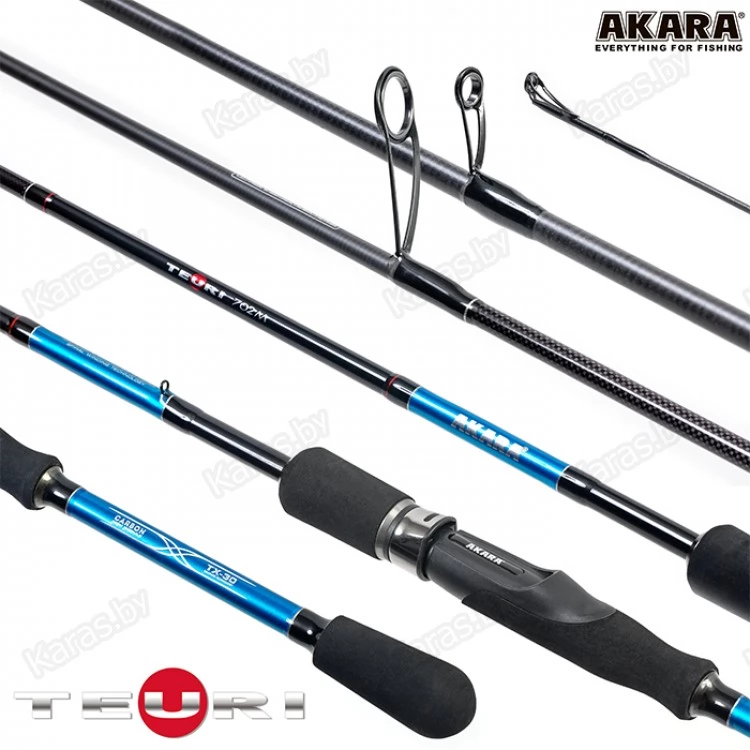 Обновление в модельном ряду угольных спиннингов от Akara - серия Teuri. В линейке представлены, как спиннинги для ультра-лайта, так и удилища для тяжелого джига (heavy jig). Благодаря использованию графита концерна Toray TX-30 (40-ton) и инновационным технологиям плетения бланка спиннинг обладает повышенной чувствительностью при проводке, что делает его незаменимым при контактных видах ловли: джиг, твич, ловля на техасскую оснастку и с отводным поводком. При производстве бланка спиннинга использована технология UPIT. Расстановка колец произведена по технологии New Guide System, позволяющая оптимально расположить кольца на бланке, определить их количество и размер (вес). Облегчённые кольца Kujira XR Long Super Hard ZrO2 (1600-1800H, kg/mm2).