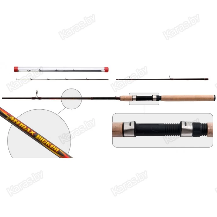 Antrax Piker – универсальный пикер в средней весовой категории. Посылистый бланк средне-быстрого строя позволяет выполнять дальние забросы и делать акцентированную подсечку. Оснащен облегченными кольцами Kujira XR Super Hard ZrO2 (1600-1800H,kg/mm2). Катушкодержатель гаечного типа. Пробковая рукоять. В комплекте сменный хлыст.