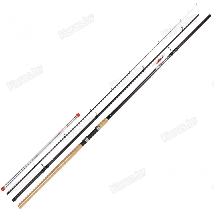 Рукоять удилища удлинённая и изготовлена из пробки. Катушкодержатель – винтовой с нижней прижимной гайкой. В комплекте идут три вершинки разной жёсткости, окрашенные в яркие цвета.