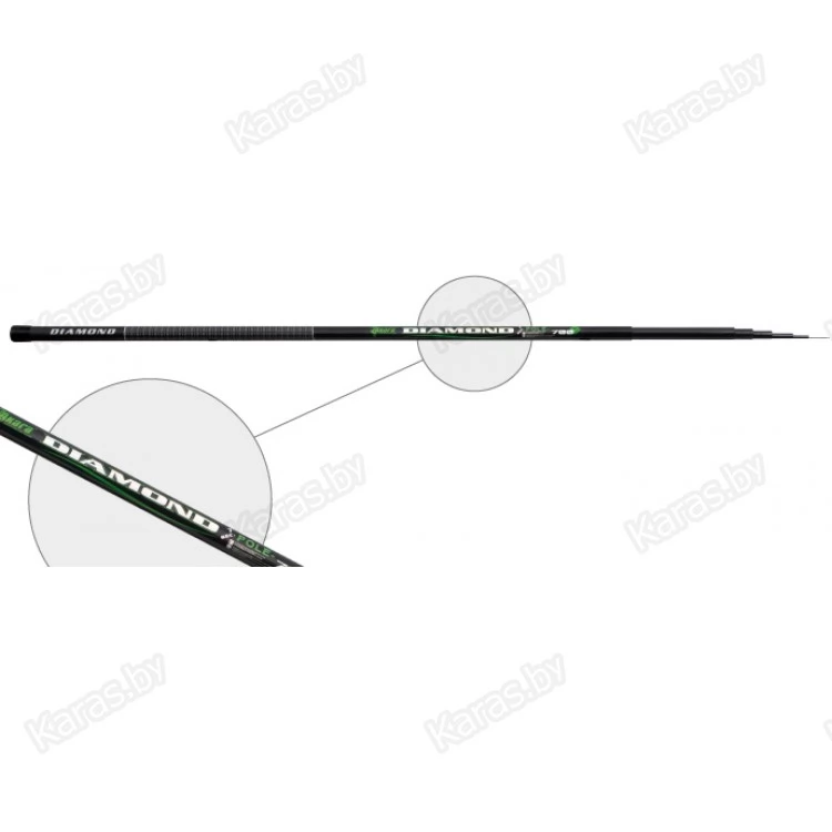 Diamond Pole - маховая удочка от Akara. Характеризуется повышенными прочностными характеристиками и бланком среднего строя. Широкий весовой диапазон используемых снастей делает удочку универсальной по использованию и позволяет её использовать как для ловли на течении так и в стоячей воде. Графит марки IM-7.
