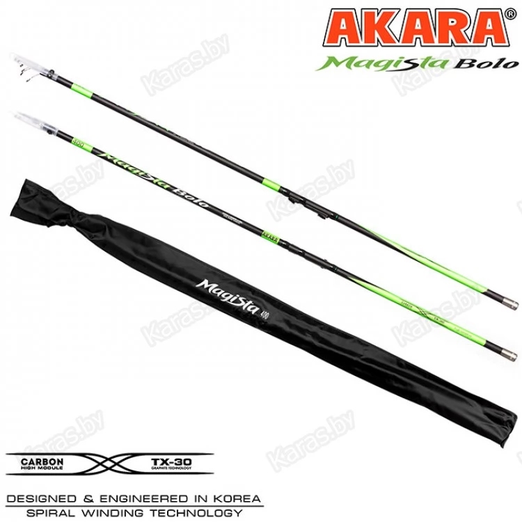 Magista Bolo - серия болонских (с кольцами) удилищ. Данная серия представлена тремя типоразмера-ми 4,00 м, 5,00 м и 6,00 м с диапазоном тестов 15-40 грамм. Удилища относятся к классу компакт. Удилища Akara Magista Bolo выполнены из высокомодульного карбона TX-30 (40-ton) производства Японского кон-церна Toray. Удилища оснащены облегченными кольцами из оксида циркония Kujira XR.