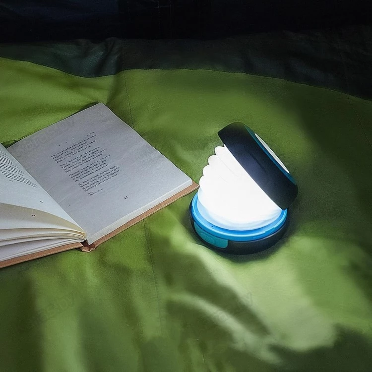Портативный складной фонарь. Подзарядить фонарь можно двумя способами: подзарядка от солнечной батареи и от USB. Фонарь компактен и прост в использовании. Удобная ручка для подвешивания в палатке и переноса. Три режима работы: яркий, средней яркости, мигающий.