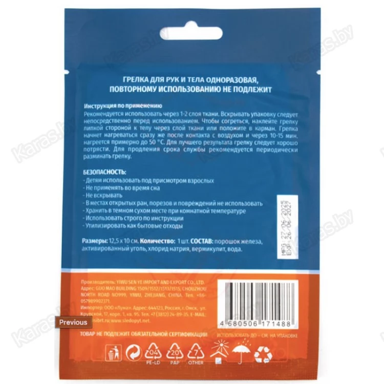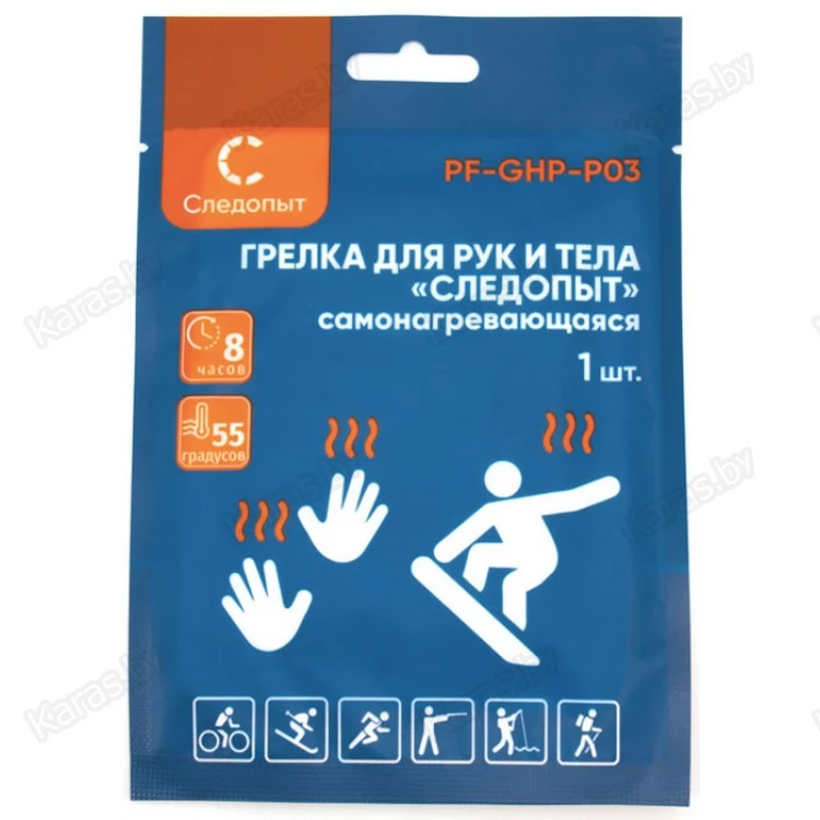 Самонагревающаяся грелка для тела и рук "Следопыт" позволяет не замерзнуть во время долгих прогулок, спортивных тренировок на открытом воздухе, а также рыбалке или охоте. Размещается в карманах, варежках или приклеивается липкой стороной к телу через слой ткани. Вскрывать упаковку необходимо только перед использованием. Перед применением встряхнуть, во время использования периодически разминать. Грелка нагревается до 50°С через 10 - 15 мин. после контакта с воздухом. Не приклеивать на кожу! Одноразовая, повторному использованию не подлежит. Размеры: 12,5 х 9 см. В упаковке 1 шт.