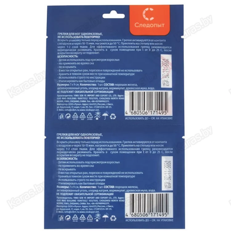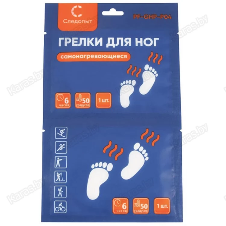Самонагревающиеся грелки для ступней ног "Следопыт" позволяют не замерзнуть во время долгих прогулок, спортивных тренировок на открытом воздухе, а также рыбалке или охоте. Грелки приклеиваются липкой стороной к стельке или носку изнутри. Вскрывать упаковку необходимо только перед использованием. Перед применением встряхнуть, во время использования периодически разминать. Грелка нагревается до 50°С через 10 - 15 мин. после контакта с воздухом. Не приклеивать на кожу! Одноразовые, повторному использованию не подлежат. Размеры: 9х7 см. В упаковке 2 шт.