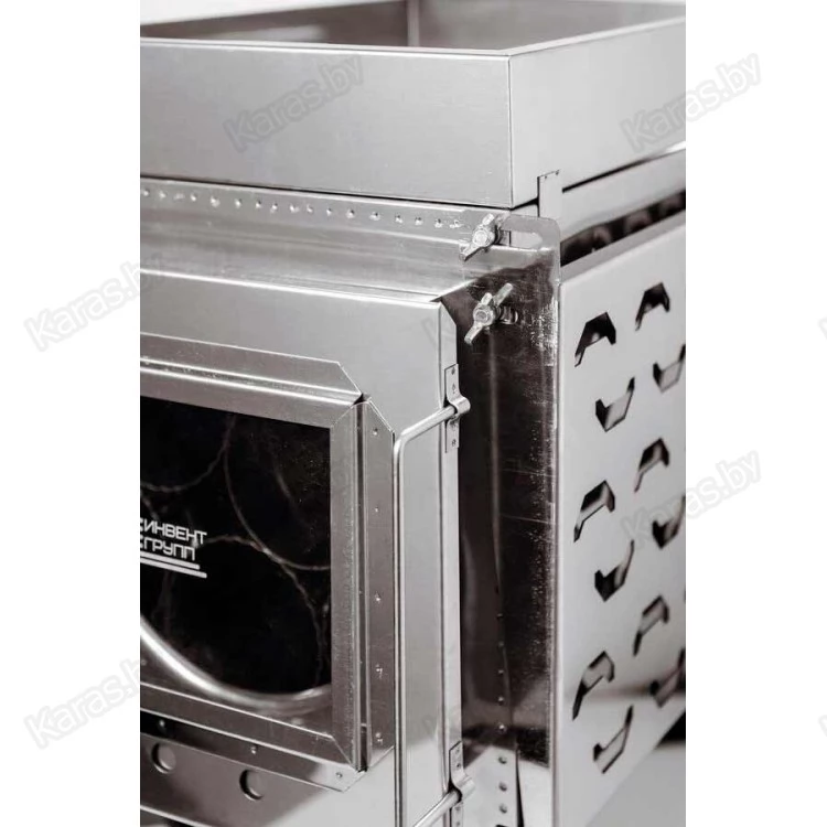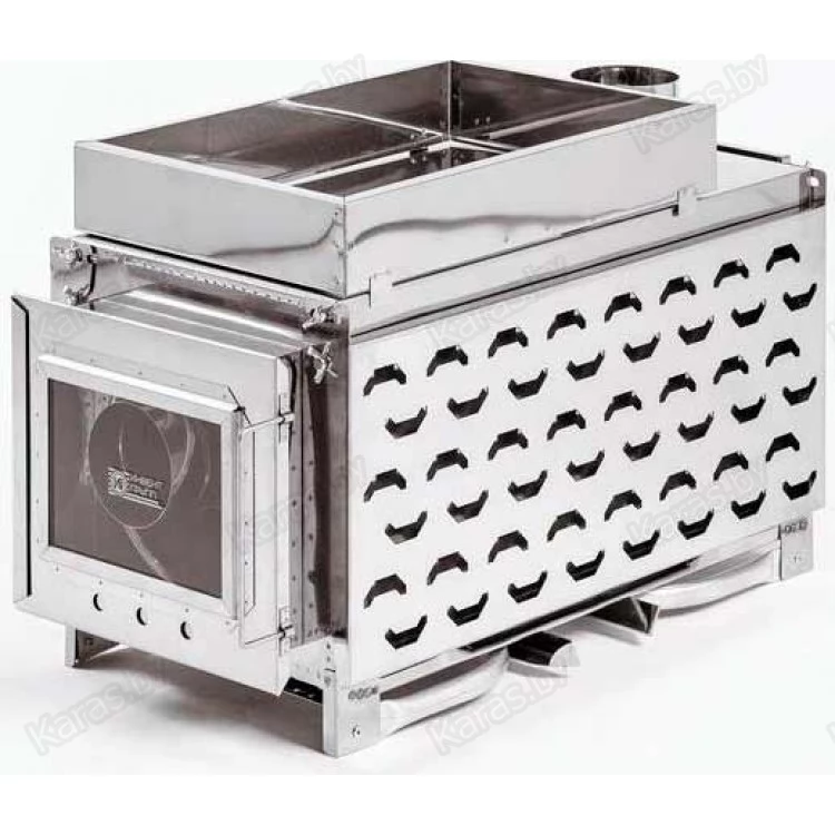 Данная конструкция печи, позволяет экономить топливо (отрегулирована сила потока тяги), разогревать и готовить пищу, с помощью съемного короба размещать камни для использования печи как банной.