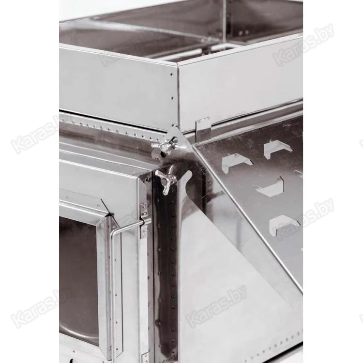 Печь состоит из металлического короба с внутренней перегородкой-искрогасителем с оснащенным выходом под дымоходную трубу, имеет четыре защитных экрана, два из которых (боковые) — экраны-трансформеры, съемный короб для закладки камней, складные ножки и дымоходную трубу, состоящую из сегментов. В рабочем состоянии экраны-трансформеры выполняют защитную функцию, а так же дают дополнительную поверхность для сушки или можно использовать, как полку подставку, оба вместе и по отдельности. Топочное отверстие имеет цилиндрическую дверцу с размещенными на ней ручкой и «стаканом» для регулировки тяги.