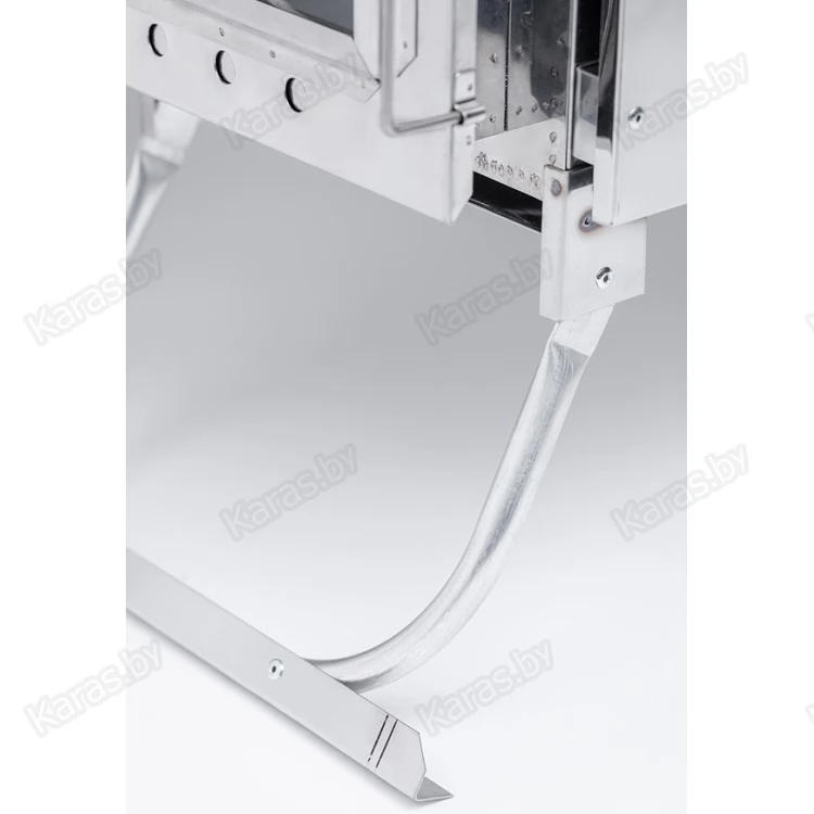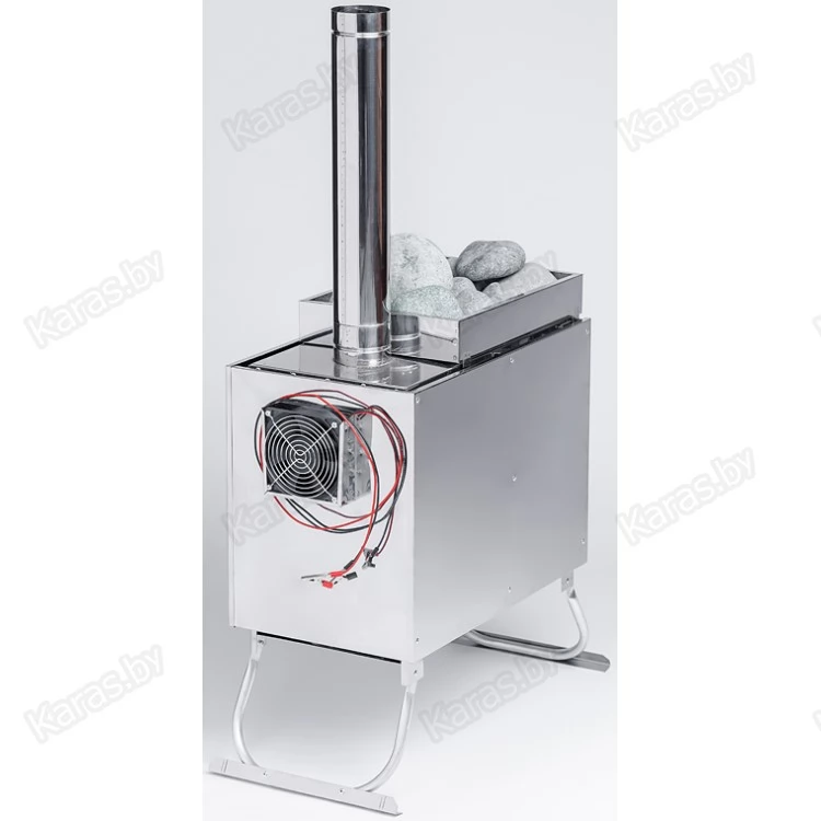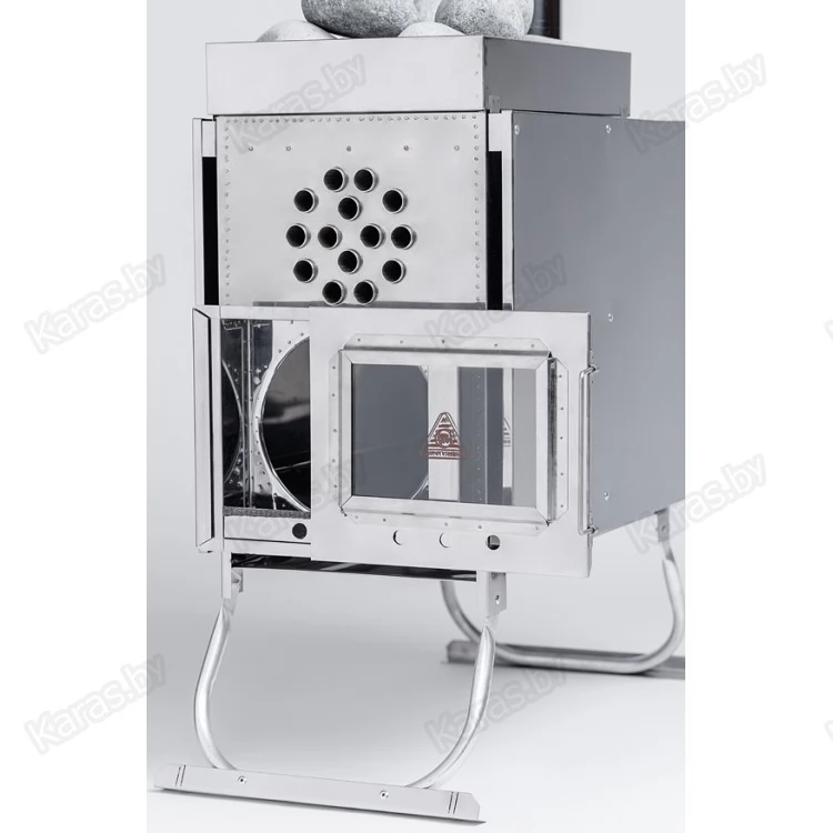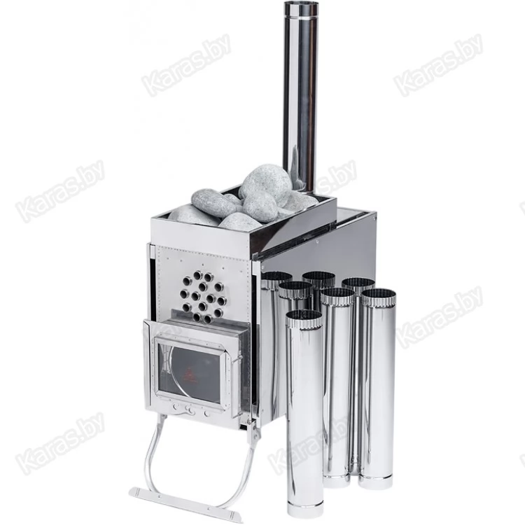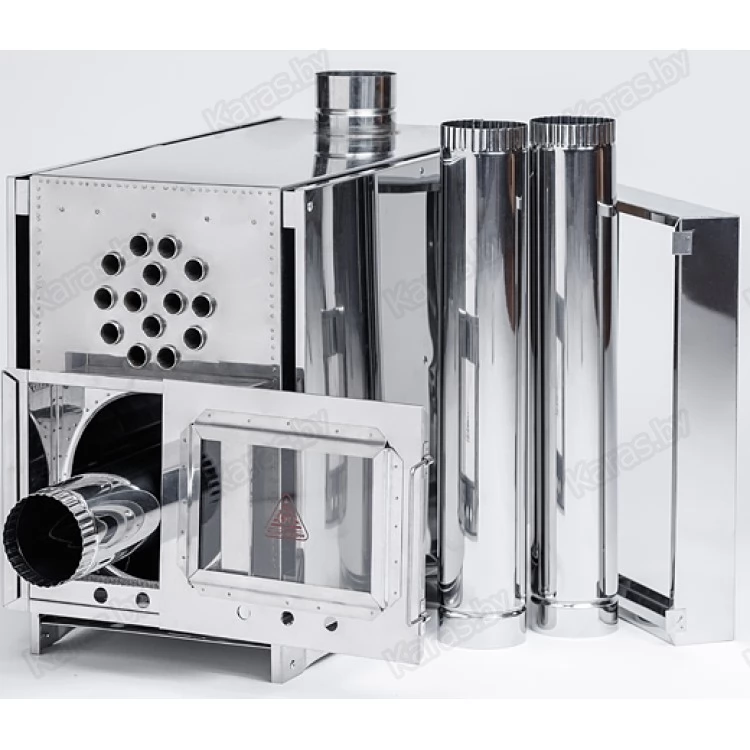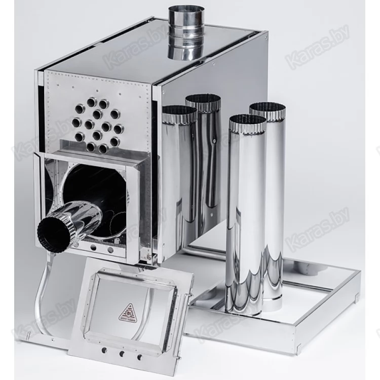 Печь-камин с теплообменником состоит из металлического короба с проходящими сквозь него трубками с внутренней перегородкой-искрогасителем и оснащенным выходом под дымоходную трубу, имеет четыре стационарных защитных экрана, быстросъёмный вентилятор, облегченные алюминиевые складные ножки, съемный короб для закладки камней и дымоходную трубу, состоящую из сегментов. Топочное отверстие имеет дверцу с ручкой в виде слайдерной крышки с термостойким стеклом и отверстиями для регулировки тяги.