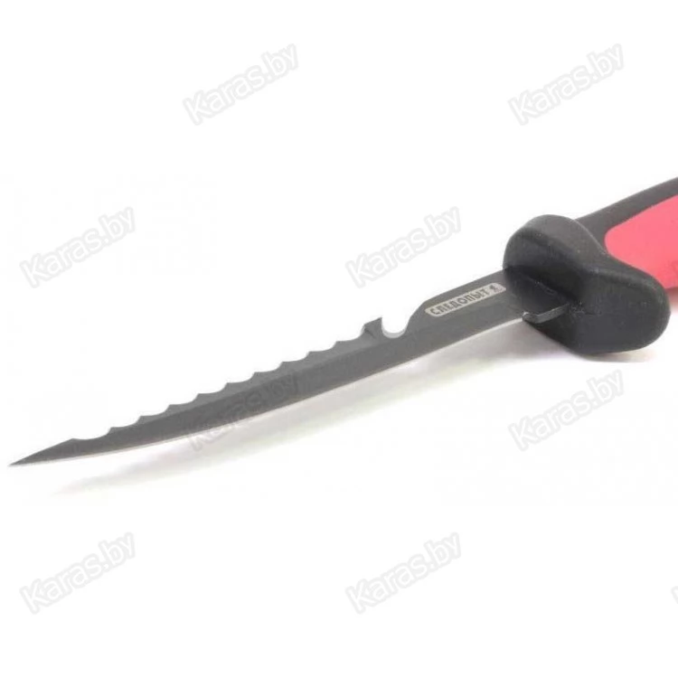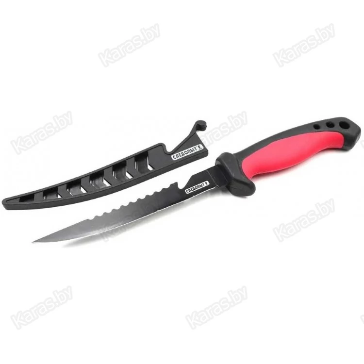 Нож разделочный филейный Следопыт используется для разделки мяса и нарезания ровных тонких кусков мяса или рыбы. Глубокая подпальцевая выемка обеспечивает отличную фиксацию ручки при работе, длинный сужающийся острый и гибкий клинок позволяет быстро отделять филе от хребта и костей. Зубчатая часть (серрейтор) на обухе лезвия предназначена для рассечения мелких костей и очистки рыбы от чешуи, рядом с ней расположен стропорез. В комплекте с ножом поставляется облегченный пластиковый чехол-ножны, повторяющий форму лезвия, с фиксатором на ручке.