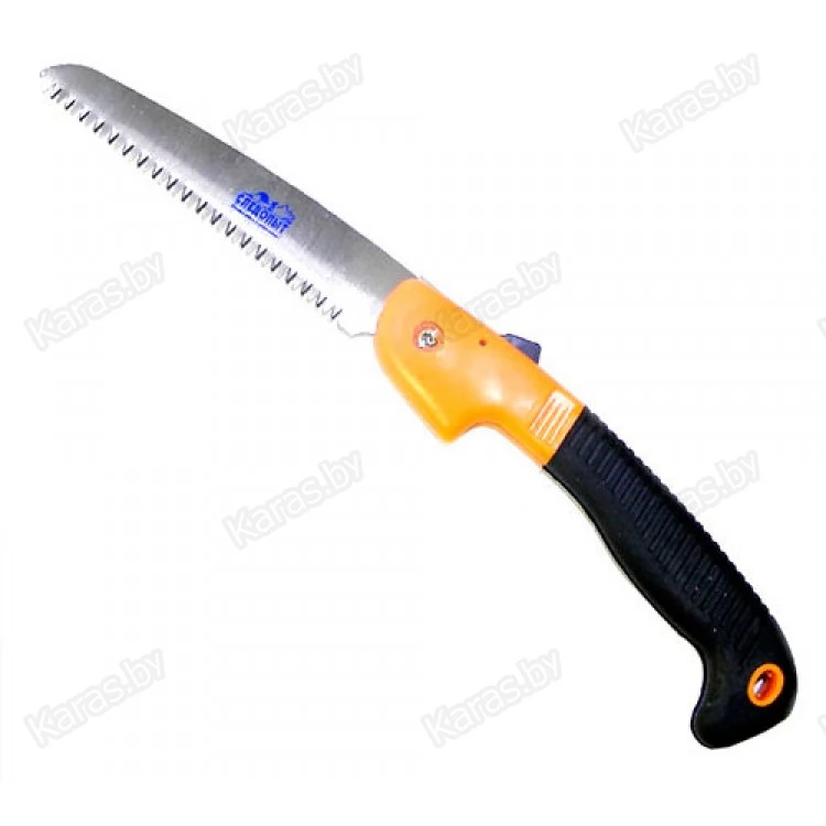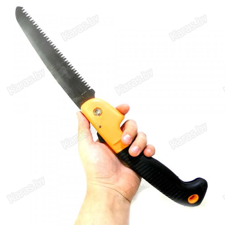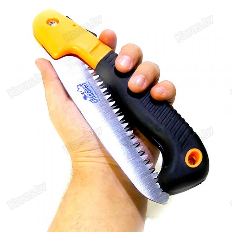 Необходимый инструмент для любого туриста. Отлично подходит для распила сучьев и небольших брёвен. Лезвие в отркытом положении фиксируется специальным замком, а в сложенном плотно удерживается в ручке. Трехгранная заточка и дополнительная закалка зубьев позволяет быстро распиливать древесину, а высококачественная сталь исключает затупление. Рукоятка пилы прорезиненная, что предотвращаяет скольжение изделия. Удобная форма пилы позволяет держать её под оптимальным углом без дополнительного напряжения кисти.
