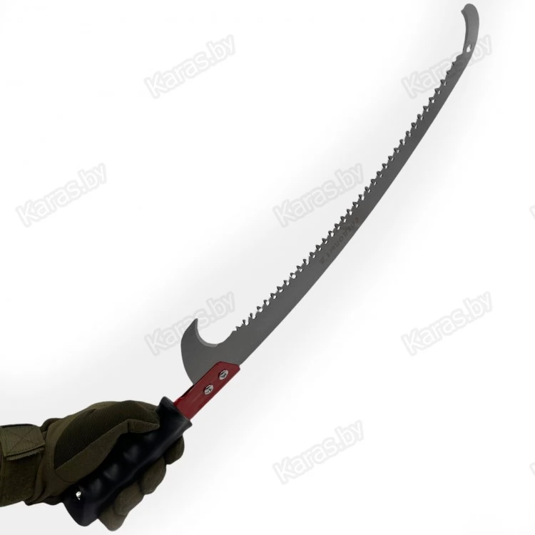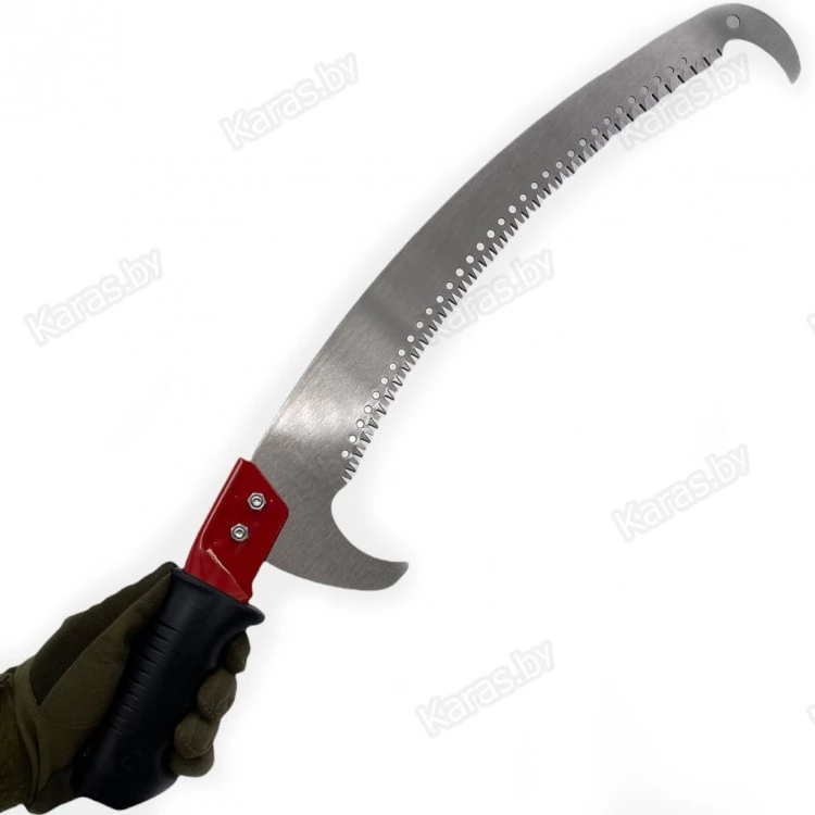 Форма пилы - изогнутая серповидная, закругленные фиксаторы-зацепы по обоим сторонам лезвия облегчает работу в условиях сумерек, верхним фиксатором удобно подцеплять надпиленные ветки, расположенные сверху.