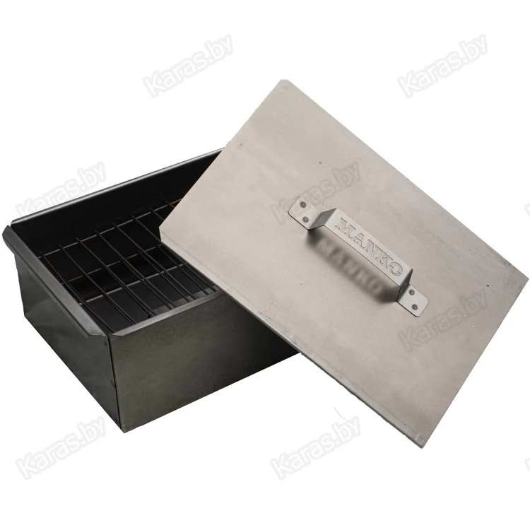 Коптильня двухъярусная с поддоном Manko, функциональный прибор, с помощью которого можно готовить рыбу, мясо и птицу, овощи. К преимуществам можно отнести небольшой вес и габариты, что позволяет брать их с собой на природу и перевозить в автомобиле. Для приготовления достаточно загрузить опилки в коптильню, именно за счёт их медленного прогорания и образуется дым, который на выходе даёт продукту специфический и многими любимый вкус и аромат.