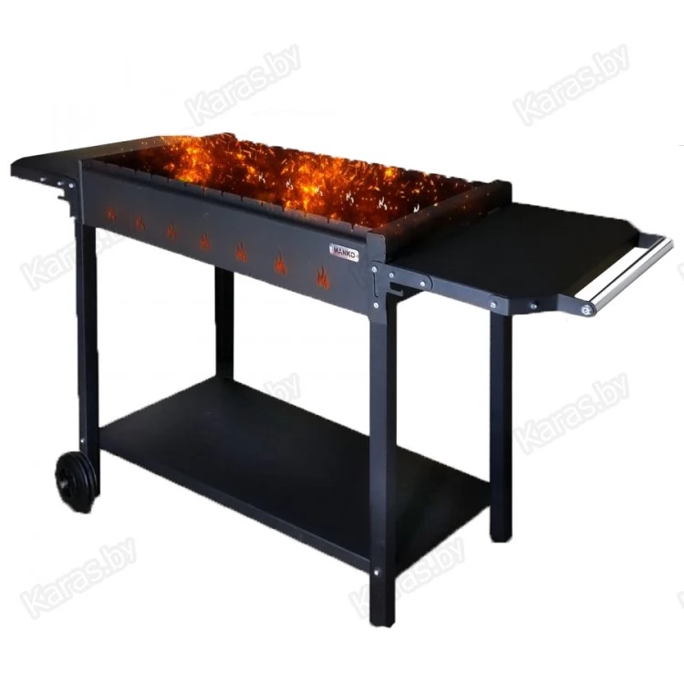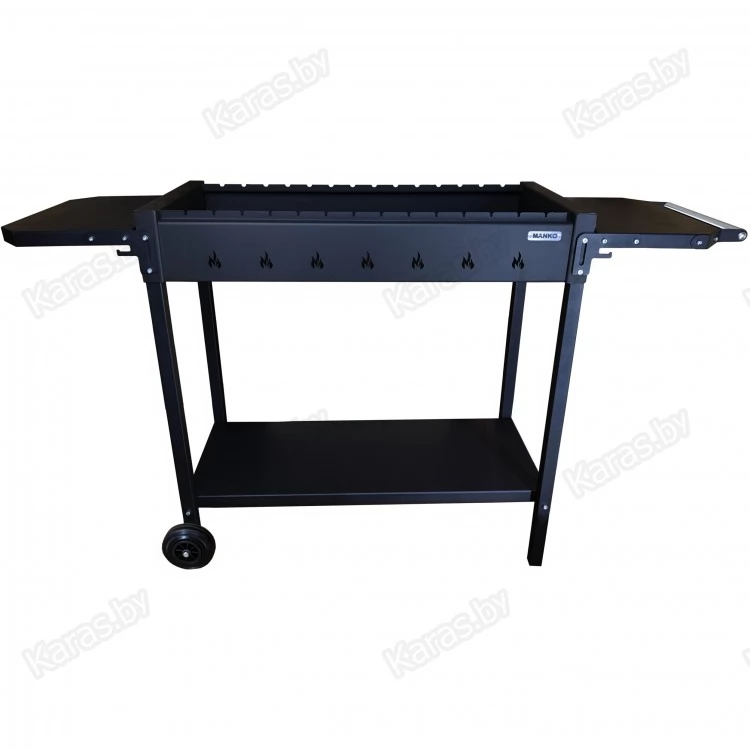 Мангал "Классик МАКСИ-5" от компании MANKO предназначен для приготовления пищи под открытым небом. Выполнен из стали толщиной 3 мм. Покрыт термостойкой краской, выдерживает 700 градусов по цельсию. Практичный и удобный. Имеется две складных боковых и одна нижняя полка для продуктов и дров. А так же, колёса для удобного перемещения. Вмещает 14 шампуров.