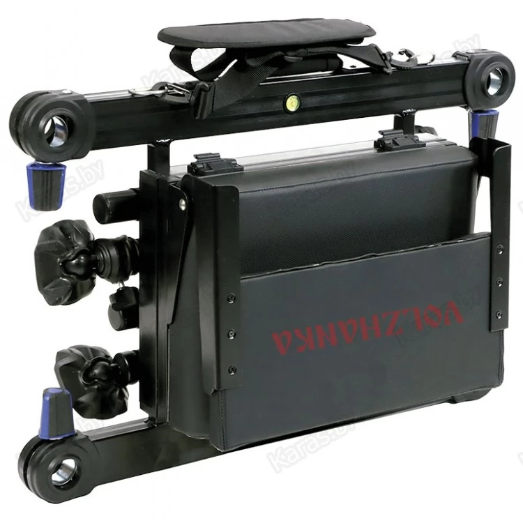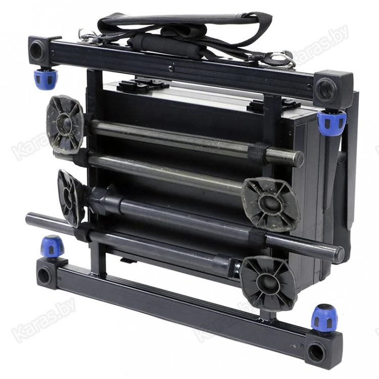 Каждая рама комплектуется двумя передними телескопическими ногами 45/80 см и двумя задними, длиной 45 см. При транспортировке ноги компактно размещаются внутри рамы платформы и пристёгиваются к ее конструкции с помощью «липучек».  Сиденье платформы оборудовано спинкой, а спереди - специальной выемкой, которая позволяет надежно фиксировать комель длинного махового или штекерного удилища. Для ровной установки на берегу,  рама имеет жидкостной двухплоскостной уровень. Комфортную транспортировку обеспечивают специальная ручка и удобный плечевой ремень, который при желании можно легко отстегнуть.