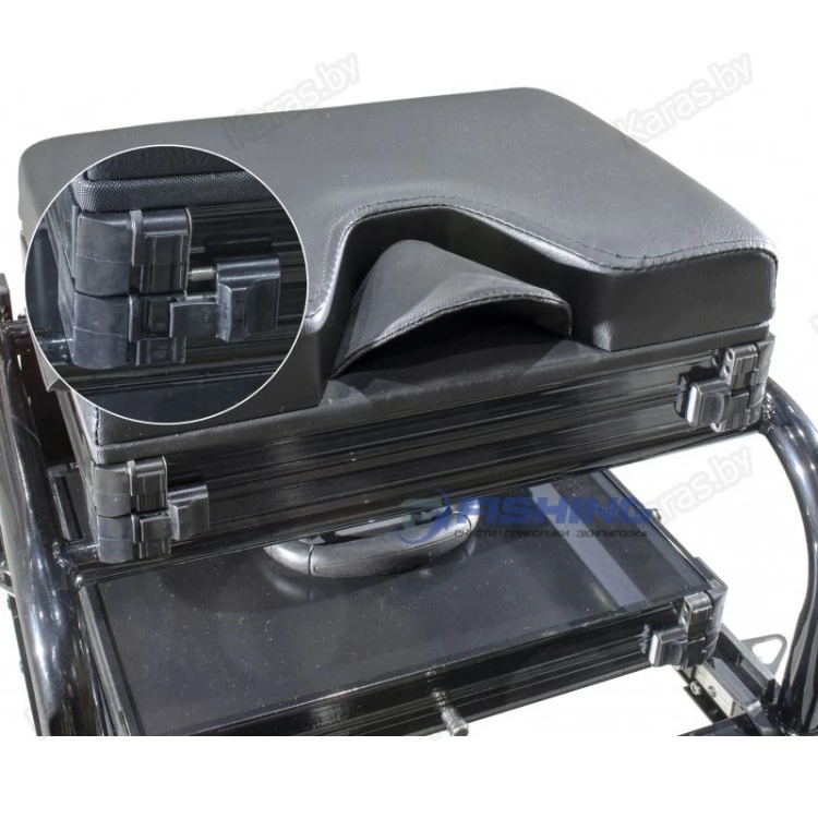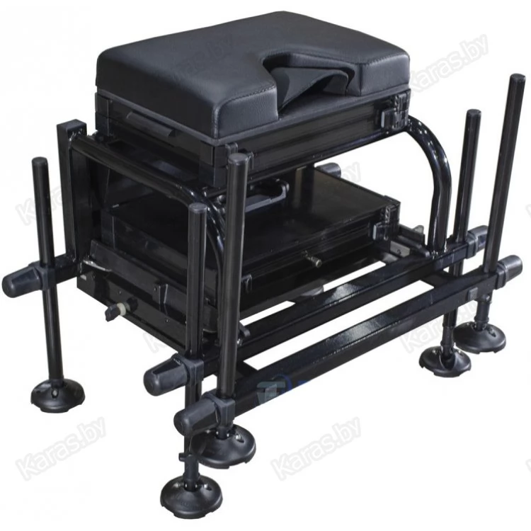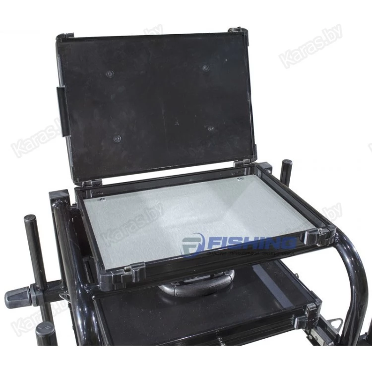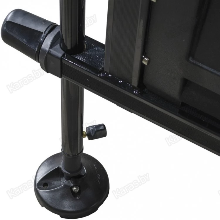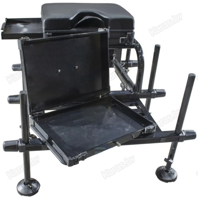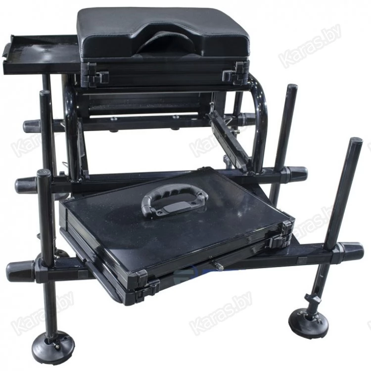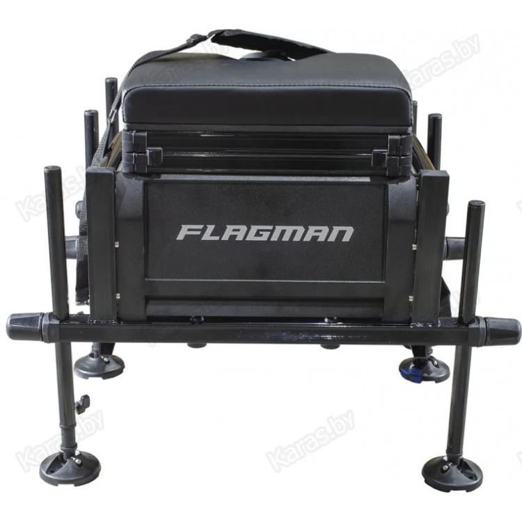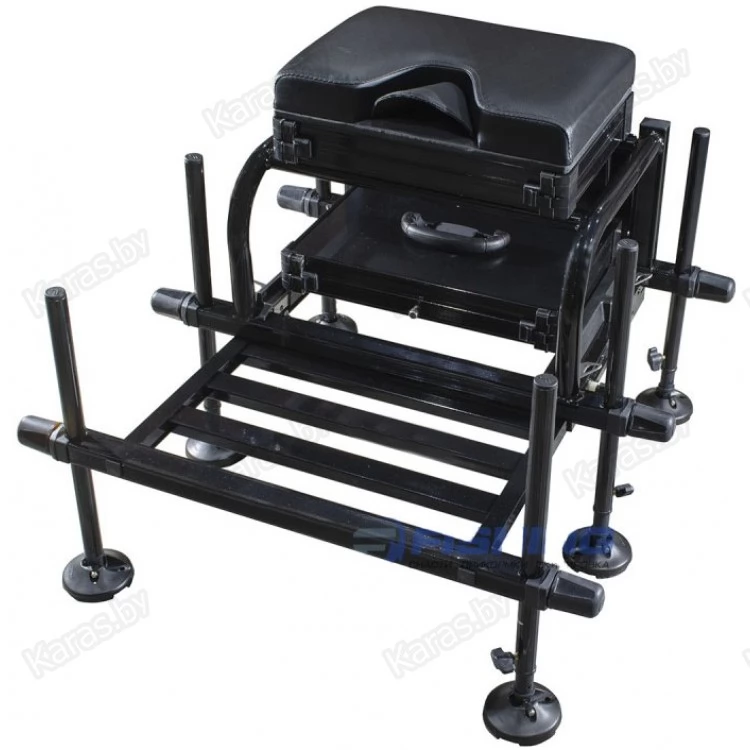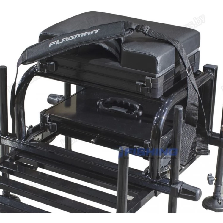 Прочная, устойчивая платформа, которая удовлетворяет требованиям как любителей, так и профессионалов. Ее основу составляет мощная сварная рама из алюминиевых труб. К ней крепятся основной модуль с ящиком, сидением и выдвижным ящиком (выдвигается в сторону), а также дополнительный съемный выдвижной модуль, который может быть дополнен модулями, приобретаемыми отдельно. Специальный фиксатор не дает этому модулю самопроизвольно выдвигаться. Основной модуль также может быть доукомплектован дополнительными модулями. В конструкции модулей использованы специальные защелки-шарниры, которые дают возможность открывать крышку модуля с двух сторон. Удобное, мягкое сидение оснащено держателем для комля штекерного удилища. Платформа оборудована алюминиевой, выдвижной педаной. В комплект входят 6 ног: 4 – на платформу, 2 – на педану. 4 из 6 ног имеют телескопическую конструкцию. Широкие пятки не дают платформе проваливаться в грунт. Они сделаны таким образом, что могут наклоняться в любую сторону, благодаря чему легко устанавливаются на неровном рельефе. Для переноски платформы предусмотрен быстросъемный ремень с четырьмя точками крепления. Ноги имеют диаметр 25 мм, на них можно установливать навесное оборудование Flagman, которое имеет оригинальные быстросъемные крепления — они позволяют устанавливать оборудование сбоку, что особенно важно при использовании нескольких единиц на одной ноге. Каждую из них можно снимать и присоединять отдельно, не трогая остальные. Также можно устанавливать любое оборудование, рассчитанное на данный диаметр ног.