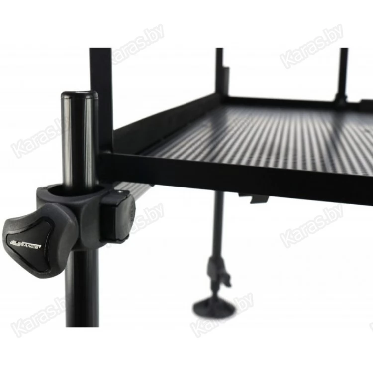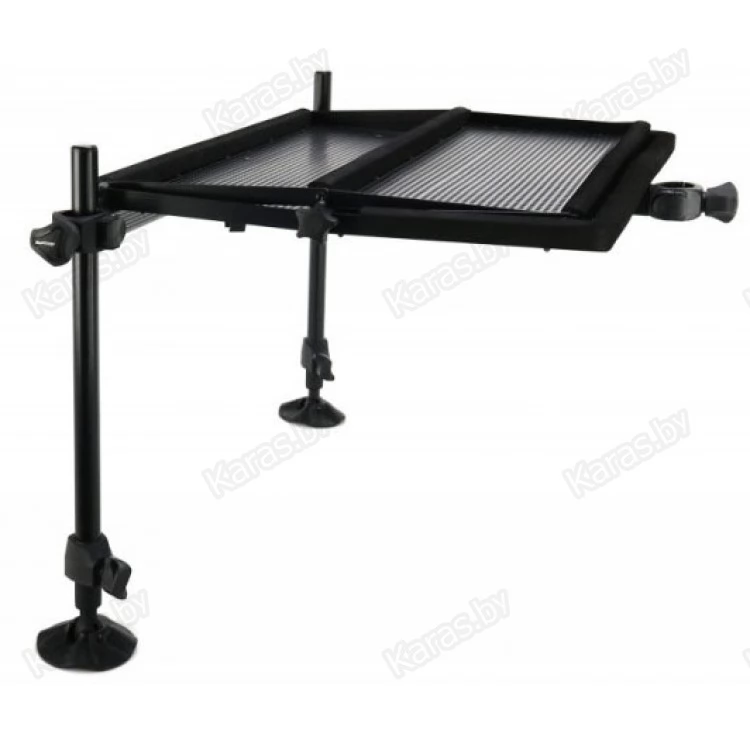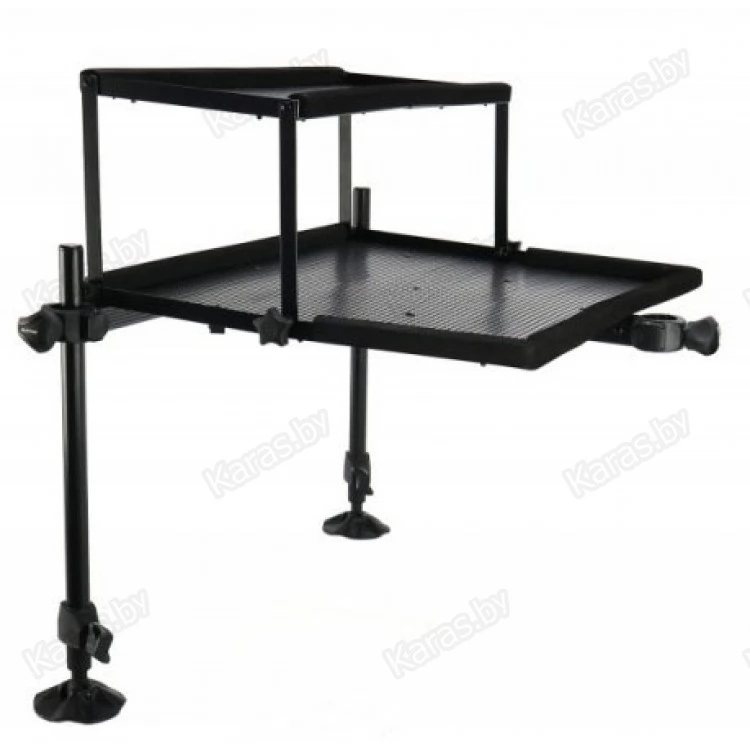 Алюминиевый столик для фидерного кресла или платформы имеющий две рабочие поверхности в разных уровнях. Размер нижней 67х50см, верхней 63х26см. Для большей устойчивости столик оборудован двумя регулируемыми телескопическими ножками диаметром 25 мм с широкими устойчивыми пятками.