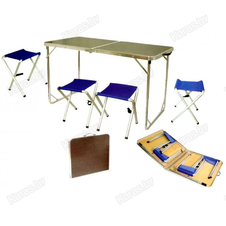В комплект мебели входит складной стол и четыре табурета с сиденьями из полиэстера. Стол увеличенного размера идеально подходит для комфортного застолья. Оптимальный размер столешницы и дополнительные крепления с обратной стороны увеличивают прочность стола. Комплект собирается в чемоданчик. Имеет дополнительный чехол для транспортировки, что позволит избежать появления лишних царапин и дольше сохранит приглядный вид мебели.