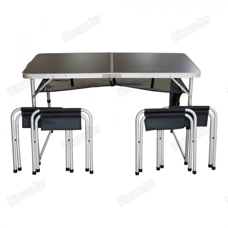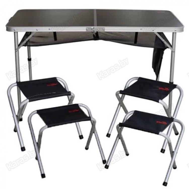Tramp TRF-067 - комплект мебели c полкой-органайзером в чехле. В набор кемпинговой мебели входят: складной стол с подвесной полкой-органайзером и 4 табурета с сиденьями из плотного полиэстера. Стол увеличенного размера идеально подходит для комфортного застолья компании из 6 человек.