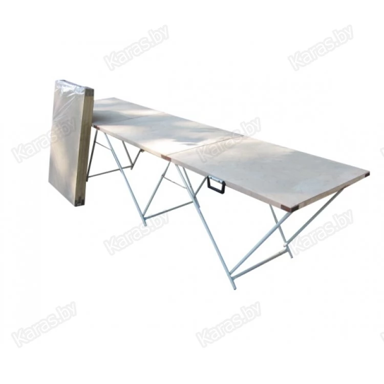 Прочный и качественный складной стол, отличающийся своими габаритными размерами. Конструкция стола включает в себя три одинаковые части, представляющие собой соединенные вместе три столика из фанеры толщиной 3 мм с ножками из стальной трубы D 16 мм, выполненными в виде треугольника. Стол имеет ручку для переноса.
