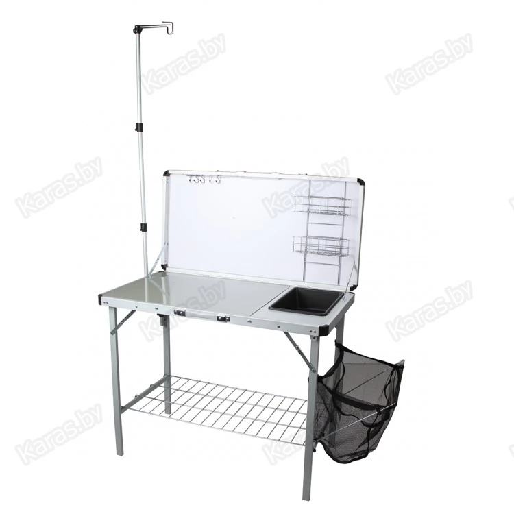 Стол кемпинговый с раковиной складной. Просторная рабочая поверхность с минимойкой, полками для посуды и рейлингом с крючками для подвески столовых приборов. Корзина для сбора мусора, кронштейн для крепления лампы.