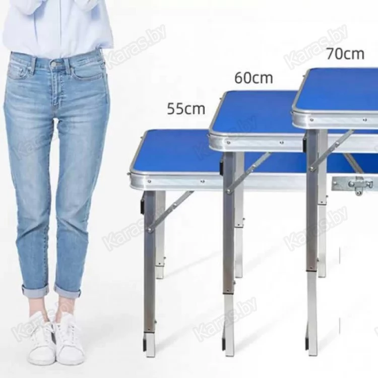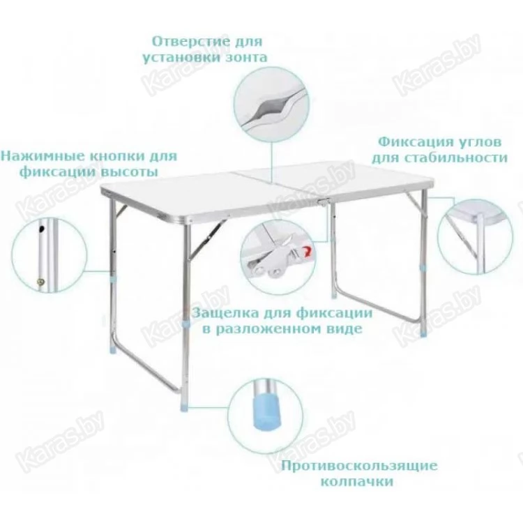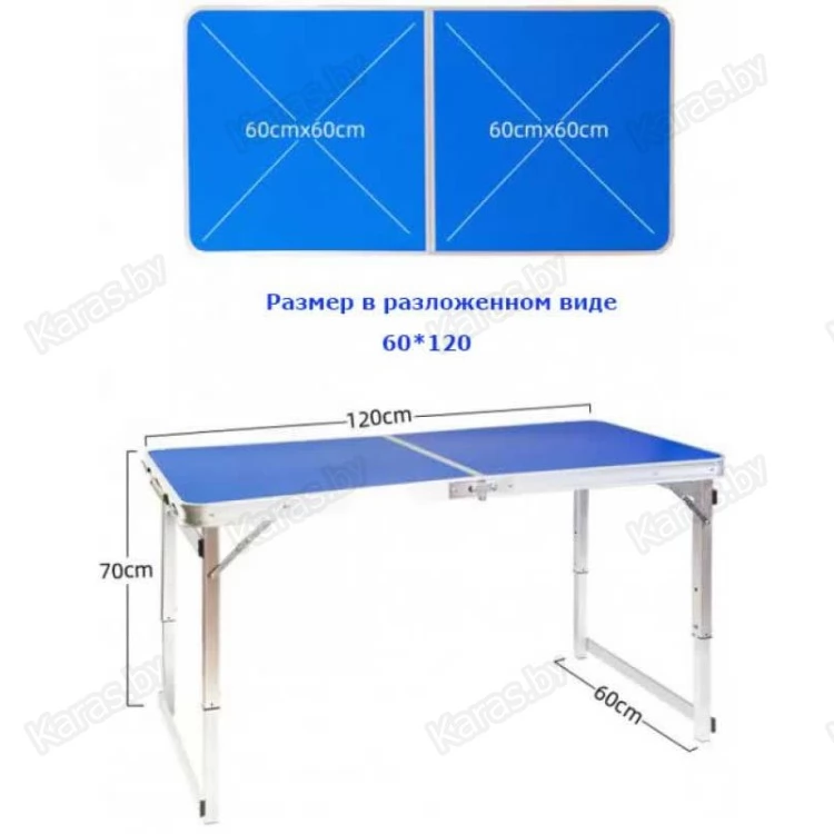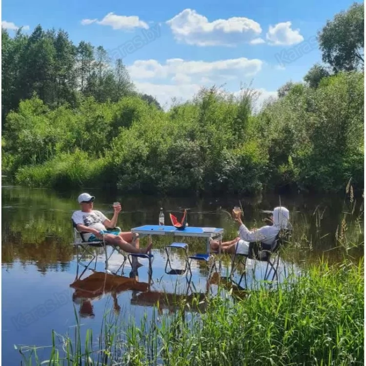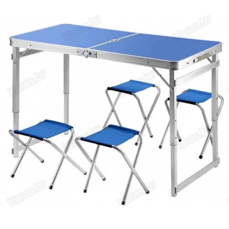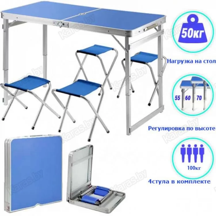 Набор из усиленного складного стола и четырех стульев. Складной стол для пикника это ваш комфорт отдыха на природе в лесу или на пляже возле озера. Изготовлен из алюминиевого сплава и выдерживает нагрузку на стол до 50 кг и на каждый стул до 100 кг. Быстро складываются в компактный кейс весом в 7.2 кг. За столом могут комфортно разместиться до 6 человек. Надежная конструкция стола при правильной эксплуатации прослужит Вам долгие годы. Размер столешницы 120х60, с регулировкой по высоте 50/60/70 см., размер стульев 30х24, высота 35 см.