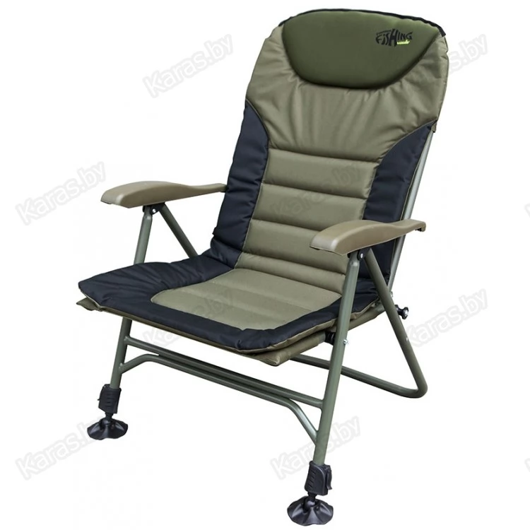 Кресло складное. Регулируемая спинка с 3 положениями. Передние ножки с возможностью независимой регулировки высоты и широкими опорами, удобный мягкий подголовник, конструкция задних ножек кресла придает дополнительную устойчивость креслу, препятствует его проваливанию в песок или рыхлую землю.