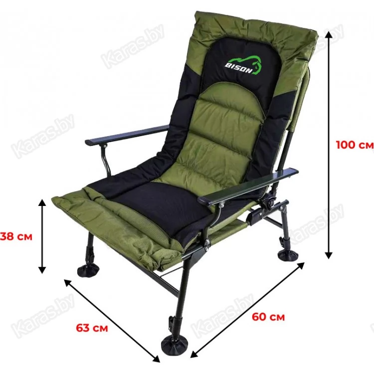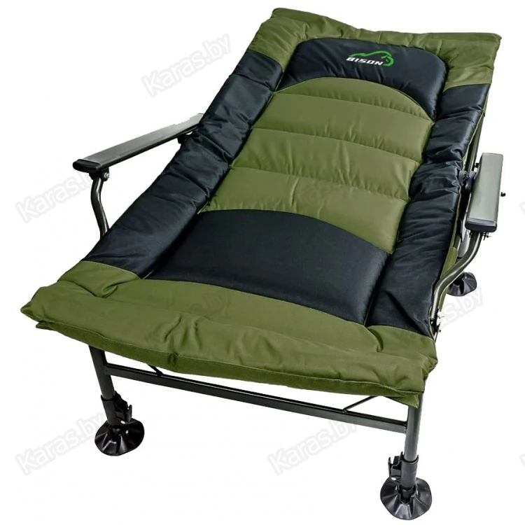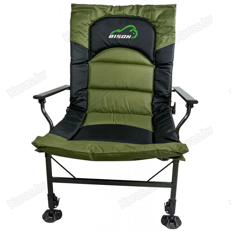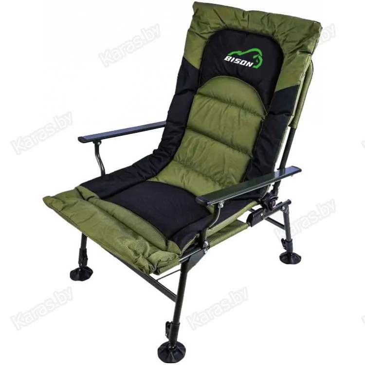 Карповое кресло Bison HBA-2021 — рыбаки оценят данную модель, так как можно отрегулировать по высоте и наклону каждую ножку. На неровных поверхностях это очень актуально. Также спинку можно регулировать по желанию, опускать до положения лёжа, и использовать кресло как раскладушку, тем более, что мягкий наполнитель создаёт приятные ощущения во время отдыха.