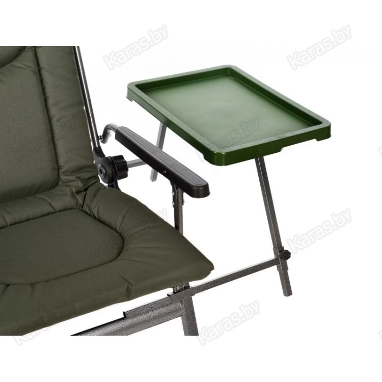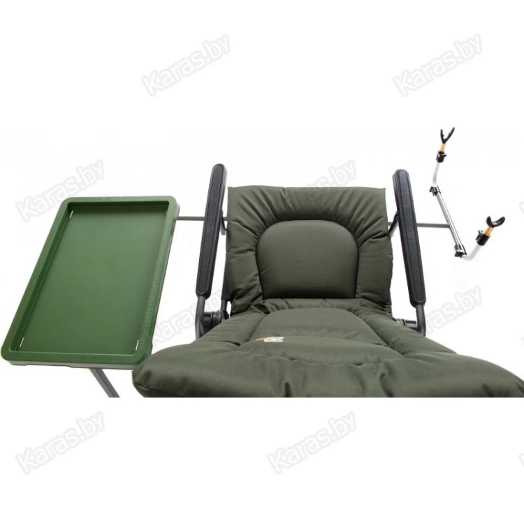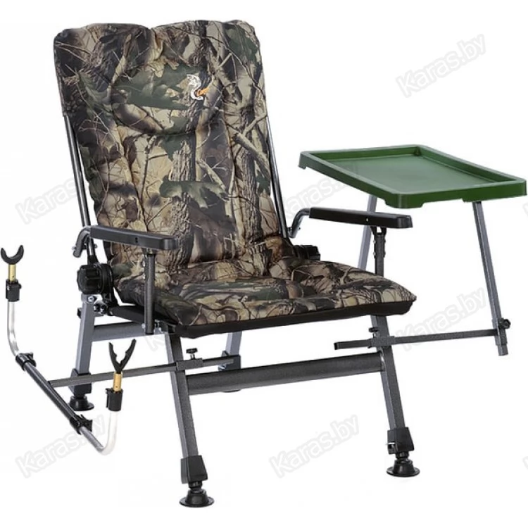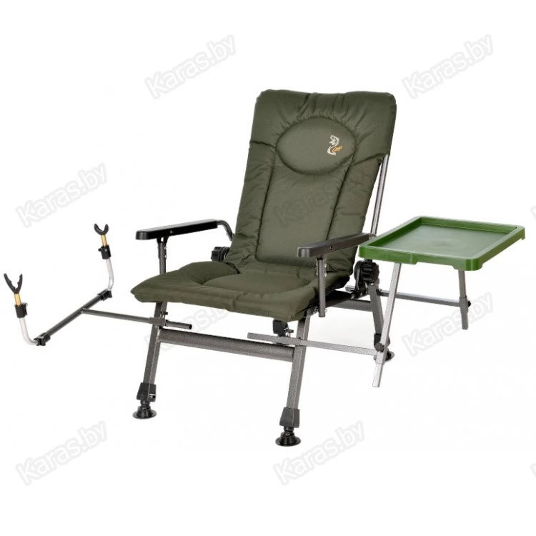 Удобное карповое кресло с подлокотниками для рыбалки и отдыха на природе. Каждая ножка регулируется по высоте, что позволяют идеально установить кресло даже на самой неровной поверхности. Спинка кресла оснащена регулятором угла наклона, что позволяет плавно переводить ее в горизонтальное положение. Дополнительно можно приобрести и установить на кресло удлиняющую подставку под ноги. За счет чего кресло можно будет легко трансформировать в лежак-раскладушку. Так же преимуществами данного кресла являются высокое качество материалов, малый вес и небольшие габариты в собранном виде. Сиденье и спинка кресла изготовлены из двойного комбинированного высокопрочного нейлона 600D с мягким наполнителем внутри. Он высокоустойчив к большой влажности, не выгорает на солнце и легко чистится от загрязнений.